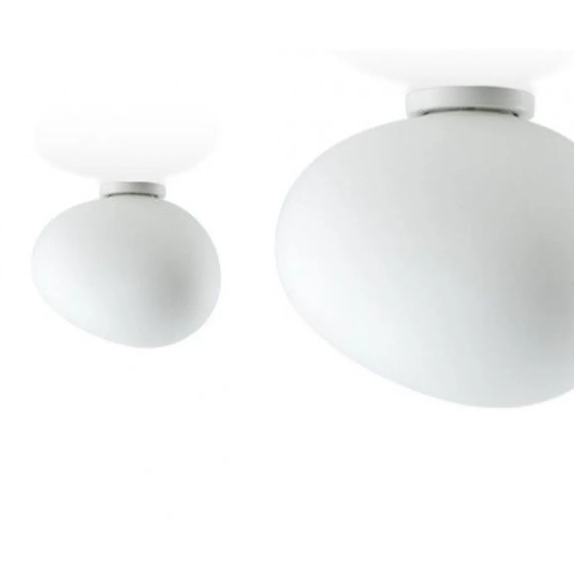 Gregg est une gamme de luminaires design dessinée par Ludovica + Roberto Palomba pour Foscarini. En verre soufflé-bouche, ce plafonnier est comme un gros caillou travaillé par le ressac de la mer. Satiné, il offre une forme organique, élégante et ne réfère pas à la géomètrie pure.
