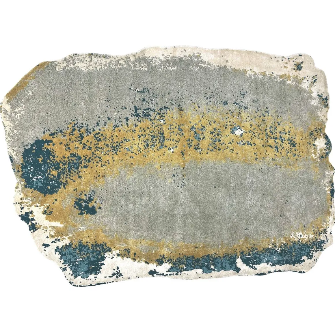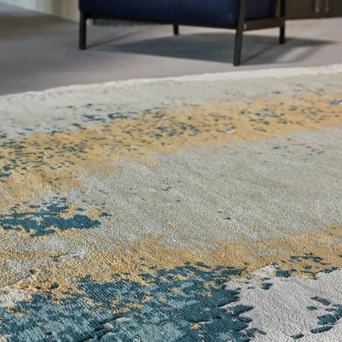Un tapis de forme irrégulière s’étend comme une faille terrestre saisissante, inspirée de l’esthétique japonaise. Ses contours brisés évoquent un passage mystérieux, un seuil entre deux mondes. Des teintes profondes de bleu et de beige contrastent avec des éclats lumineux poudré, symbolisant la lumière d’un renouveau. Il invite à la réflexion et à la découverte, une porte ouverte vers l’inconnu. Une invitation subtile à franchir le seuil d’un monde rêvé.