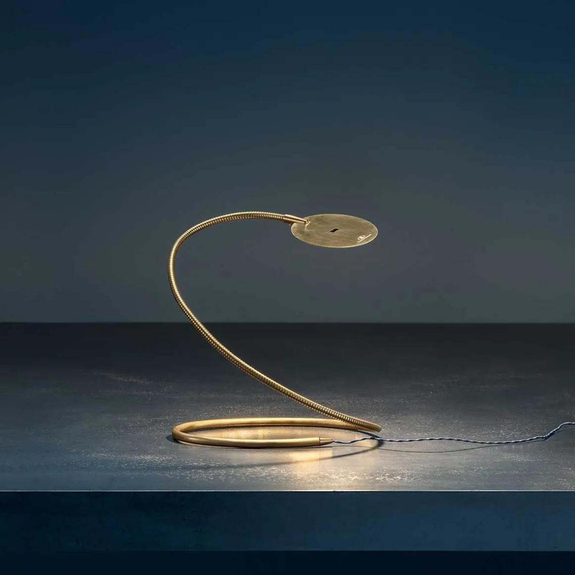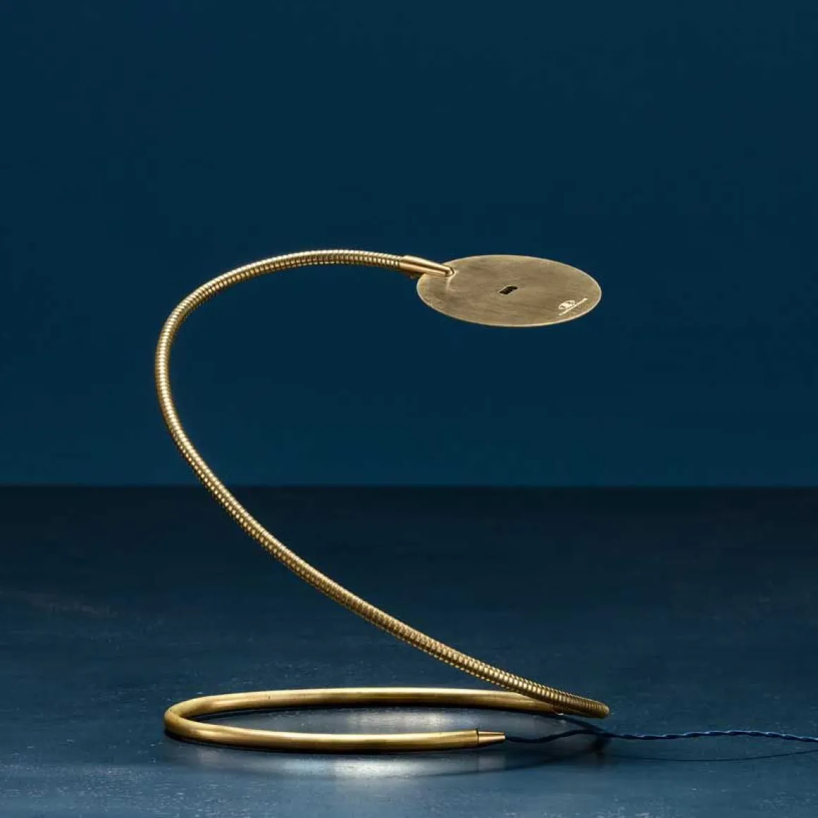 Fabriquée entièrement en laiton naturel, la lampe sinueuse Herem se caractérise par une base rigide d’où naît un bras flexible malléable, qui supporte une plaque ovale mince où est caché un panneau à LEDs avec variateur d’intensité touchless.