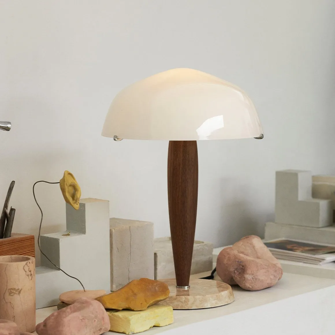 Matériaux : abat-jour en verre opale, tige en noyer, marbre beige, détails chromés, cordon textile