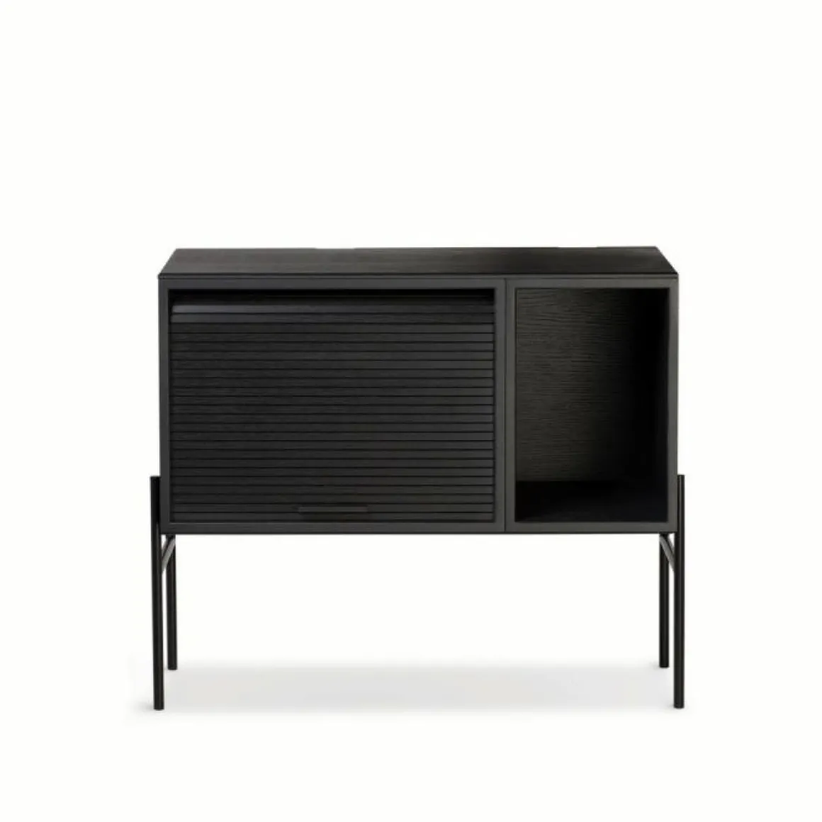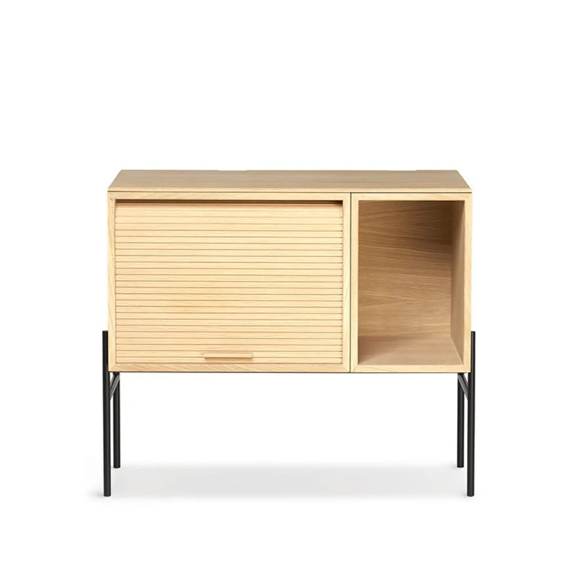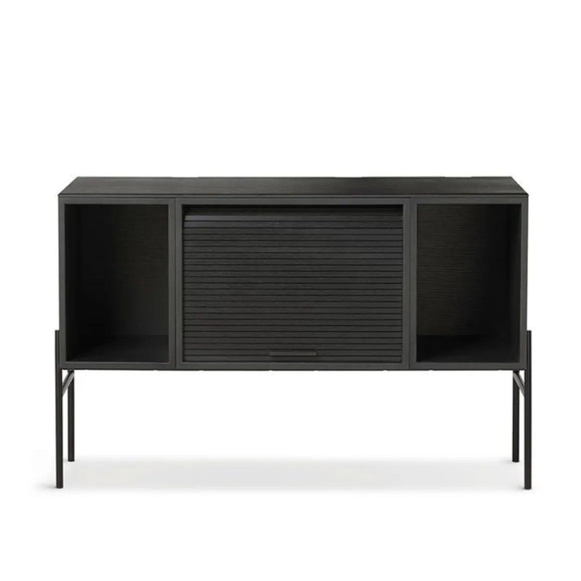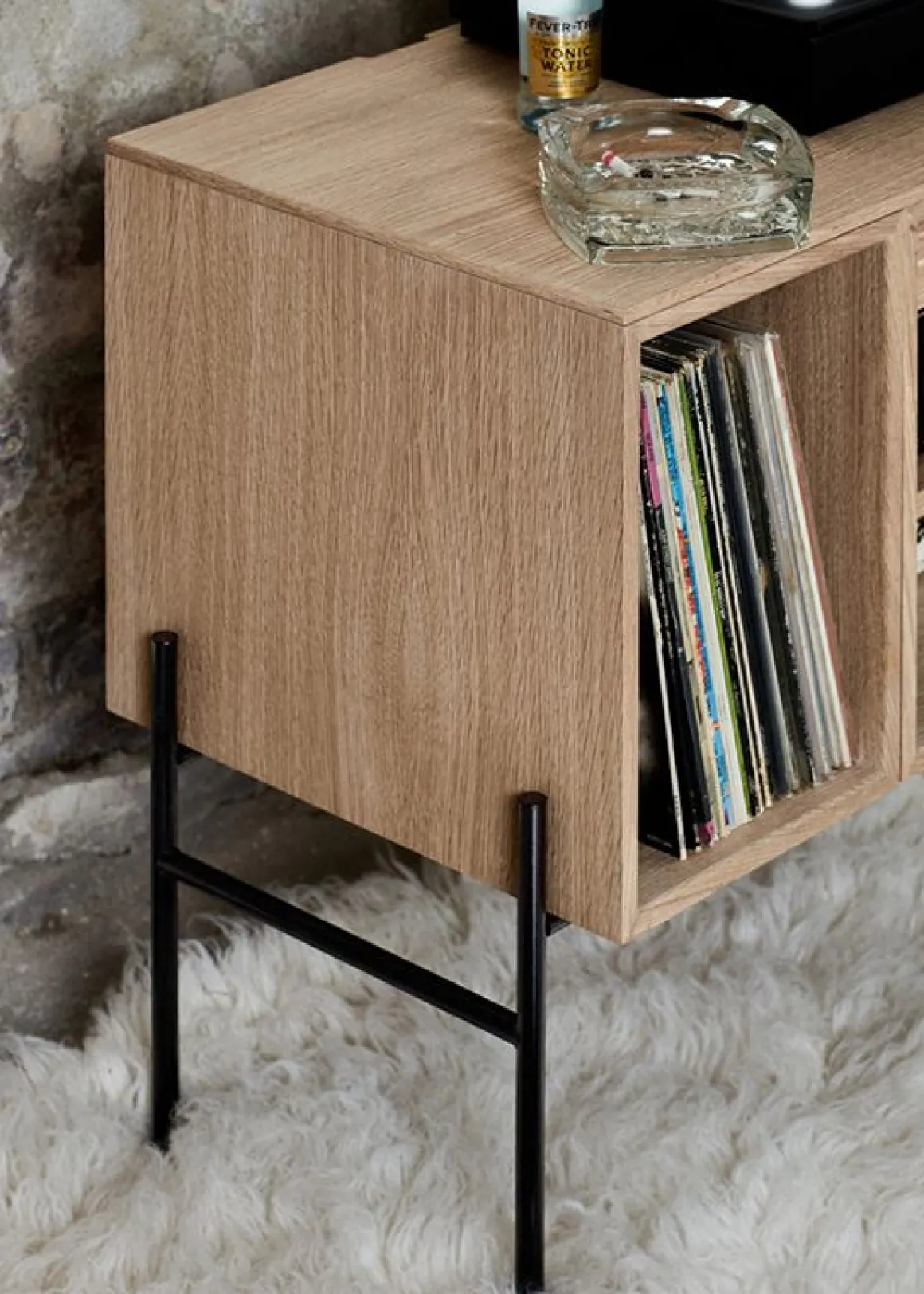 Le meuble Hifive est un sytème de stockage et de rayonnage chic. Le système comprend des composants modulaires simplifiés: une unité ouverte, une armoire avec une porte à défilement, une base métallique élégante et un plateau en bois qui unit les unités avec une seule surface. Si aucune base n’est requise, les unités peuvent être montées directement sur le mur. L’armoire est conçue pour contenir des équipements tels que des récepteurs, des amplificateurs et des lecteurs multimédia. Sa porte défilante se ferme pour dissimuler le contenu, cachant l’électronique derrière un écran en bois flexible. L’unité ouverte est dimensionnée pour accueillir les disques vinyle de la vieille école, mais peut également stocker de la musique et des médias télévisés. Les unités sont disponibles en placage de chêne fumé, en placage de chêne peint en noir et en placage de chêne couleur claire.