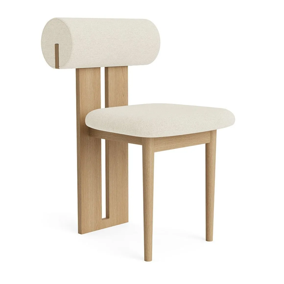 Matériaux : Le siège est fait de contreplaqué et de mousse découpée. Le dossier est en chêne massif certifié FSC et mousse découpée et les pieds sont en chêne massif certifié FSC. Recouvert avec vernis transparent à base d’eau. Le coussin de siège est remplaçable.