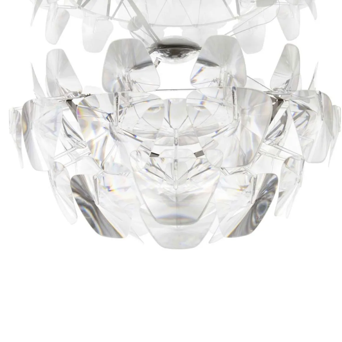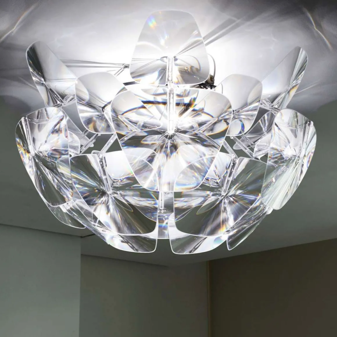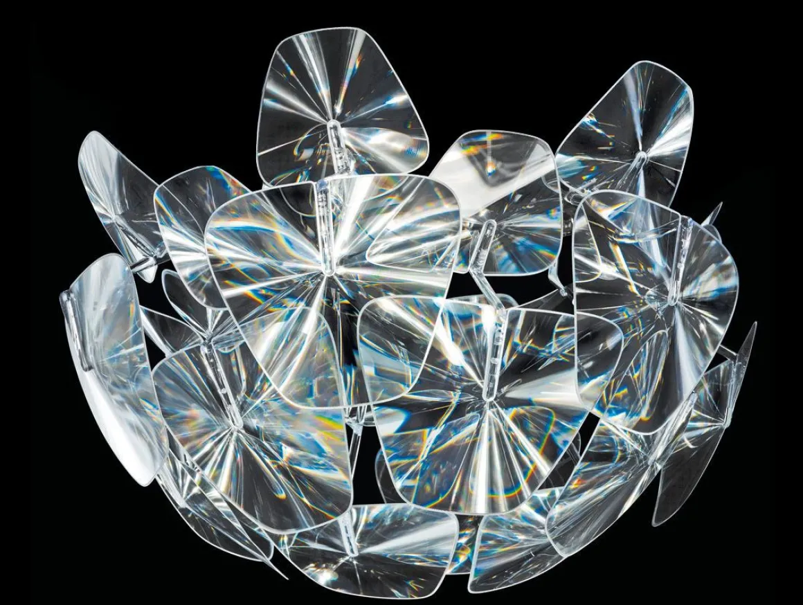 Plafonnier Hope de Luce Plan. Incroyablement léger et facile à assembler, Hope représente la magie des lampes traditionnelles, les réinterprétant avec des technologies sophistiquées et des matériaux contemporains. Une série de lentilles minces de Fresnel en polycarbonate, créées à l’aide de microprismes imprimé sur un film de polycarbonate pour obtenir un effet semblable au verre dioptrique (sans aucune limitation en termes d’espace, d’épaisseur et de poids), il faut multiplier la lumière provenant de la source lumineuse, recréer un cadre agréable, pailleté et d’atmosphère de fête, parsemé de milliers de tessons de lumière comme le diamant qui a inspiré le nom : « espoir ». Hope – le fruit d’un brillant projet et processus de fabrication – a été conçu pour être utilisé avec tout type de source de lumière : la dernière génération des halogènes et d’ampoules fluorescentes à économie d’énergie.