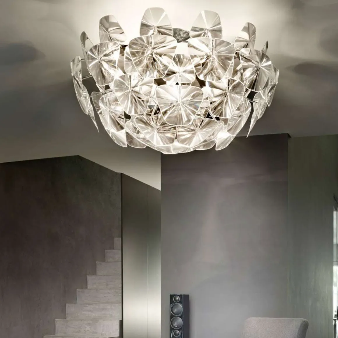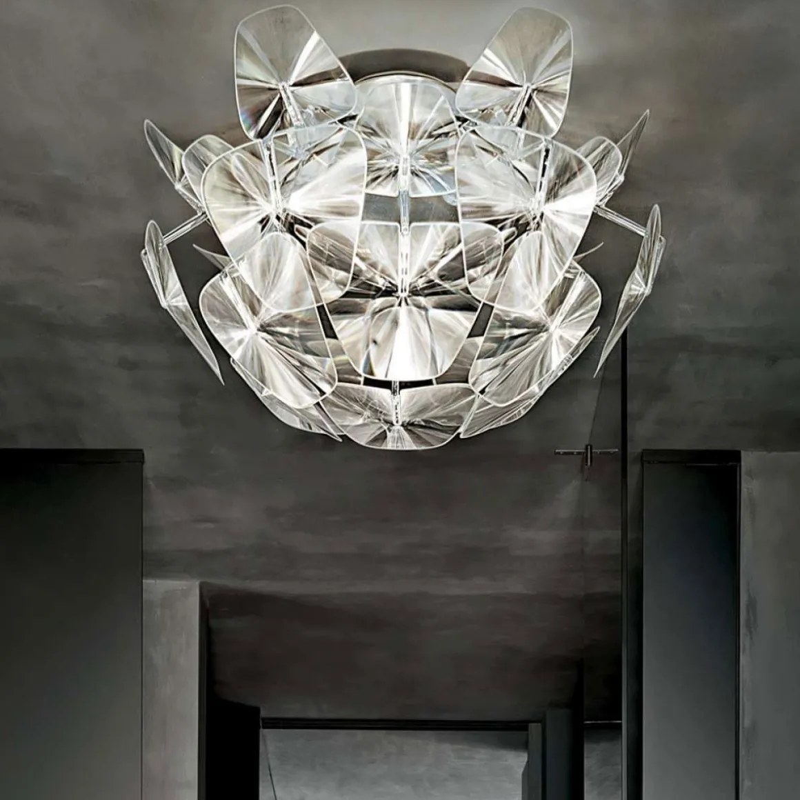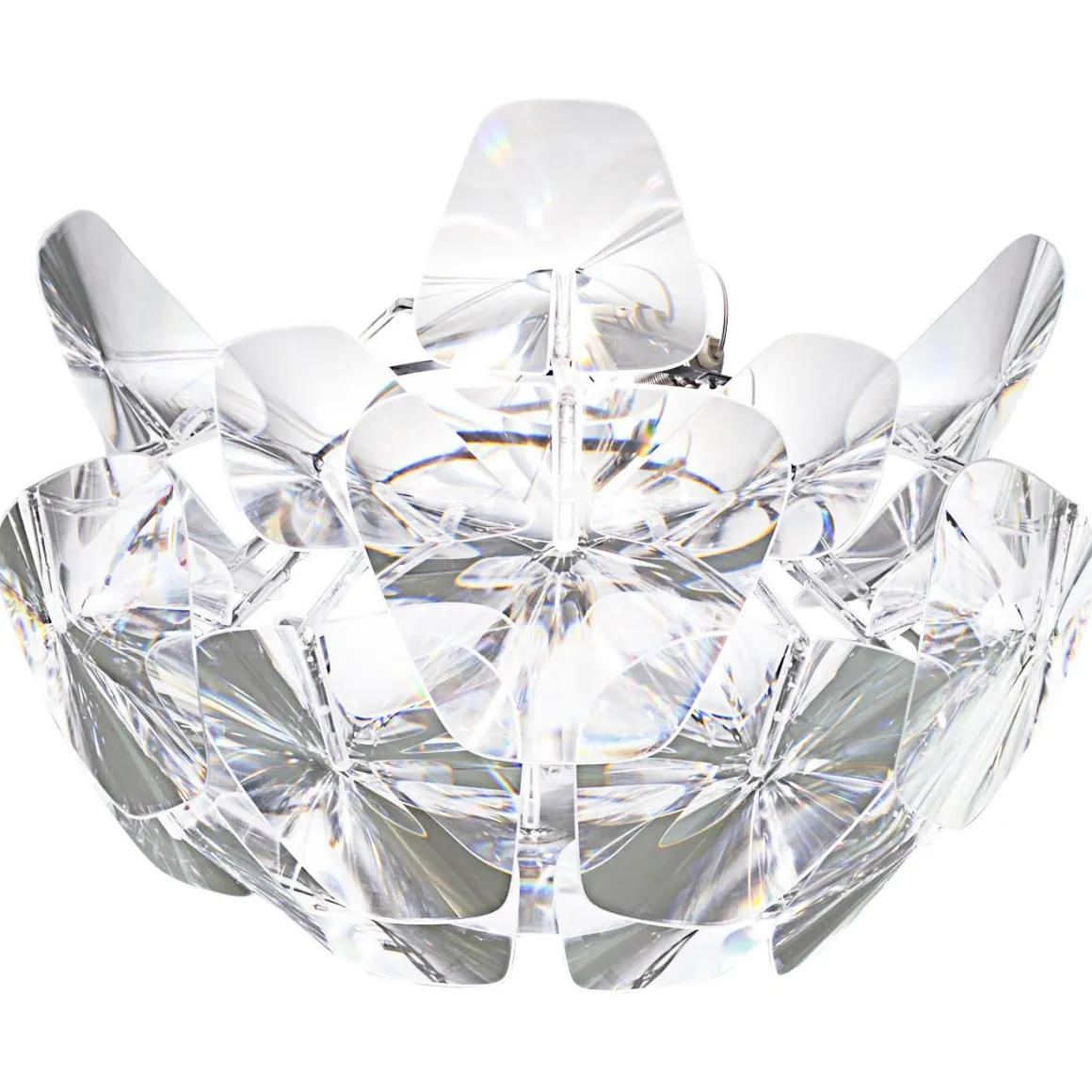 Plafonnier Hope de Luce Plan. Incroyablement léger et facile à assembler, Hope représente la magie des lampes traditionnelles, les réinterprétant avec des technologies sophistiquées et des matériaux contemporains. Une série de lentilles minces de Fresnel en polycarbonate, créées à l’aide de microprismes imprimé sur un film de polycarbonate pour obtenir un effet semblable au verre dioptrique (sans aucune limitation en termes d’espace, d’épaisseur et de poids), il faut multiplier la lumière provenant de la source lumineuse, recréer un cadre agréable, pailleté et d’atmosphère de fête, parsemé de milliers de tessons de lumière comme le diamant qui a inspiré le nom : « espoir ». Hope – le fruit d’un brillant projet et processus de fabrication – a été conçu pour être utilisé avec tout type de source de lumière : la dernière génération des halogènes et d’ampoules fluorescentes à économie d’énergie.