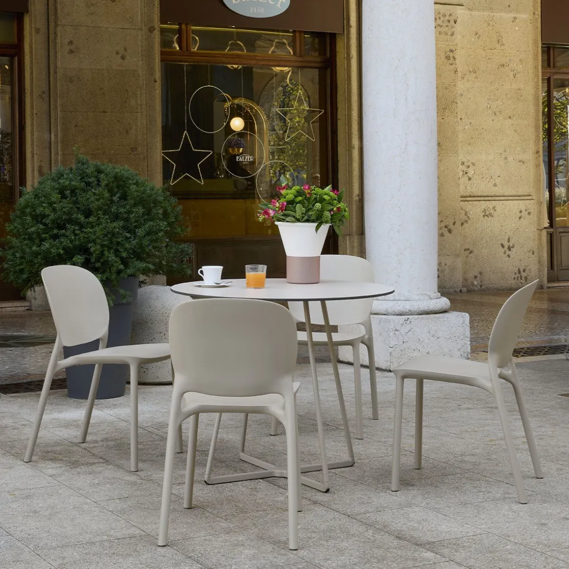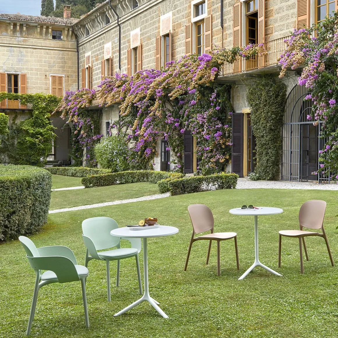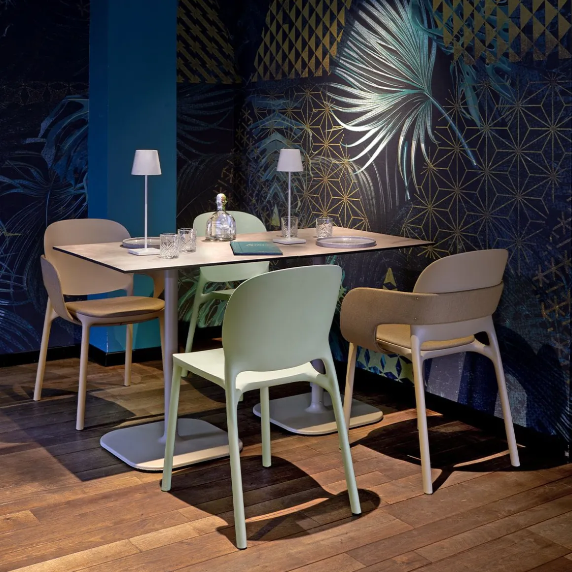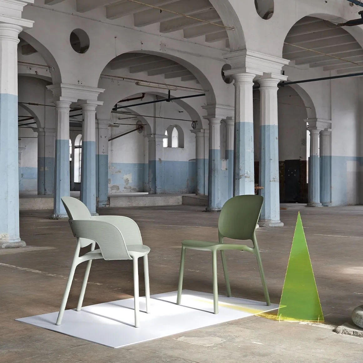 Pour HUG, chaise et fauteuil, un élément extrêmement distinctif a été pensé: entre l’assise et le dossier, aux formes arrondies et en équilibre pour une meilleure utilisation, les designers ont introduit un élément à bande, enveloppant comme une accolade. Un confort à apprécier aussi bien à l’extérieur qu’à l’intérieur, selon la tendance désormais consolidée de traiter les environnements avec les mêmes codes esthétiques. Il existe deux variantes: on pourra opter pour une version entièrement en technopolymère particulièrement graphique et belle à regarder sous tous les angles, définie par un motif à rayures en relief sur toute la longueur de la bande; ou une plus gracieuse avec l’ajout d’un coussin d’assise et d’une bande rembourrée tapissée de tissu, pour augmenter l’effet de confort enveloppant.
