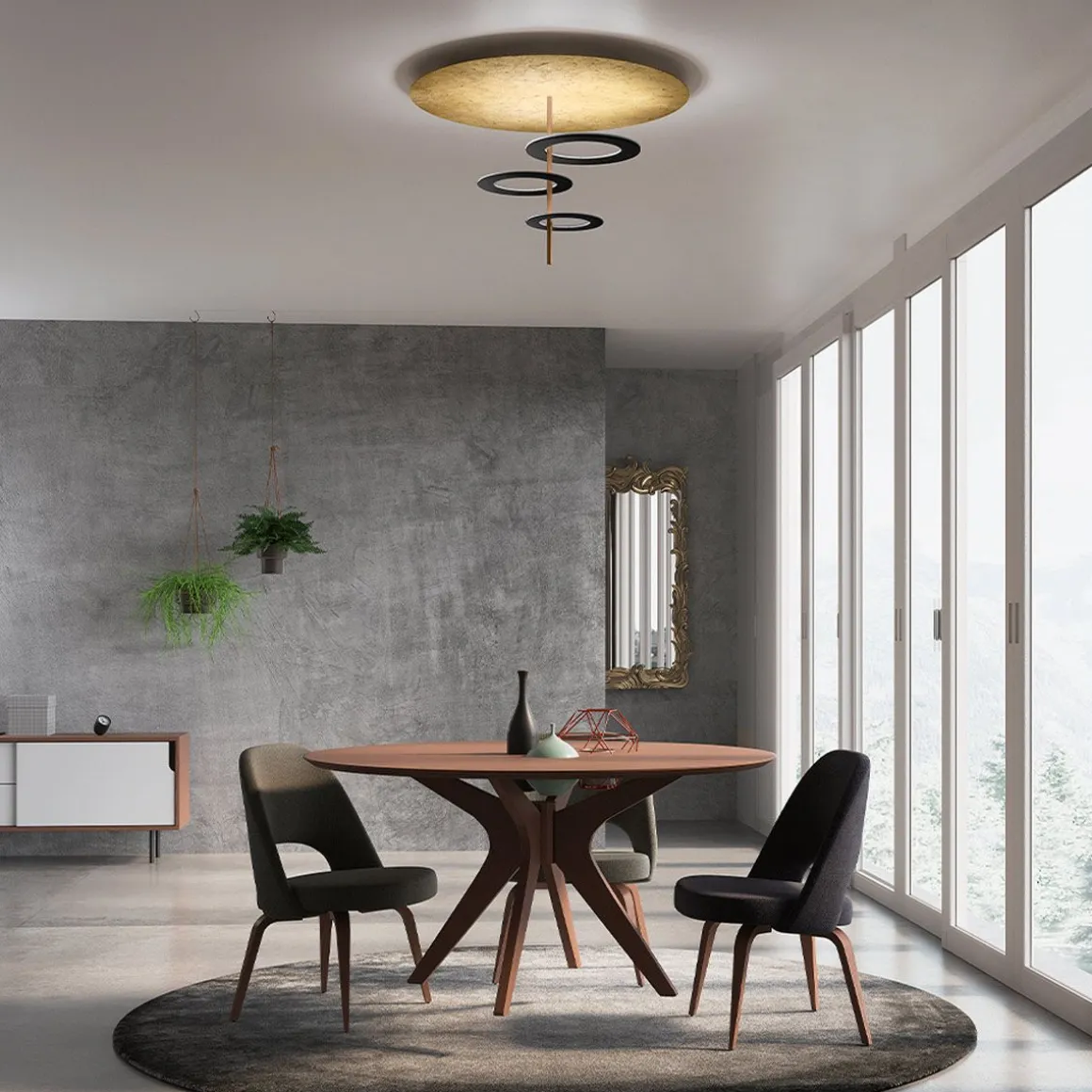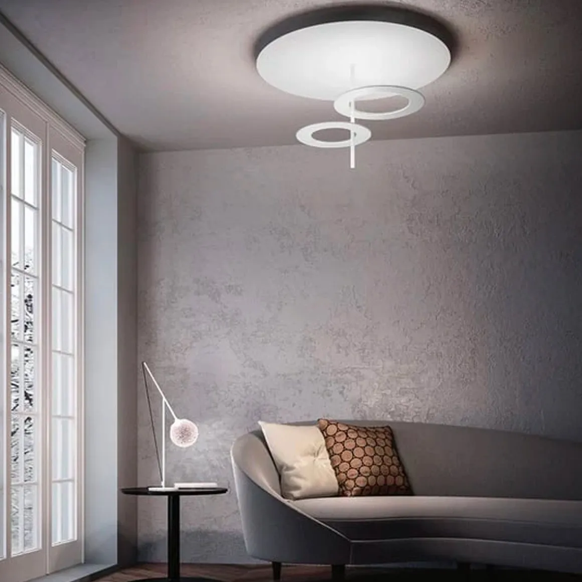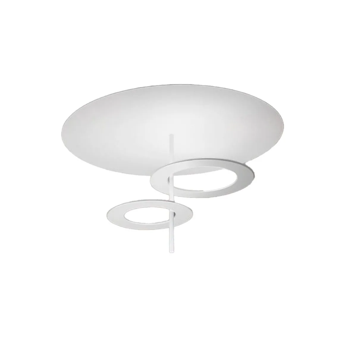 Hula Hoop de Icone par Marco Pagnoncelli. Plafonnier au design moderne, idéale pour éclairer des environnements tels qu’une chambre ou un salon. Source lumineuse LED, CRI90 à très haute efficacité énergétique, lumière réfléchie et diffuse. Alimentation incluse.
