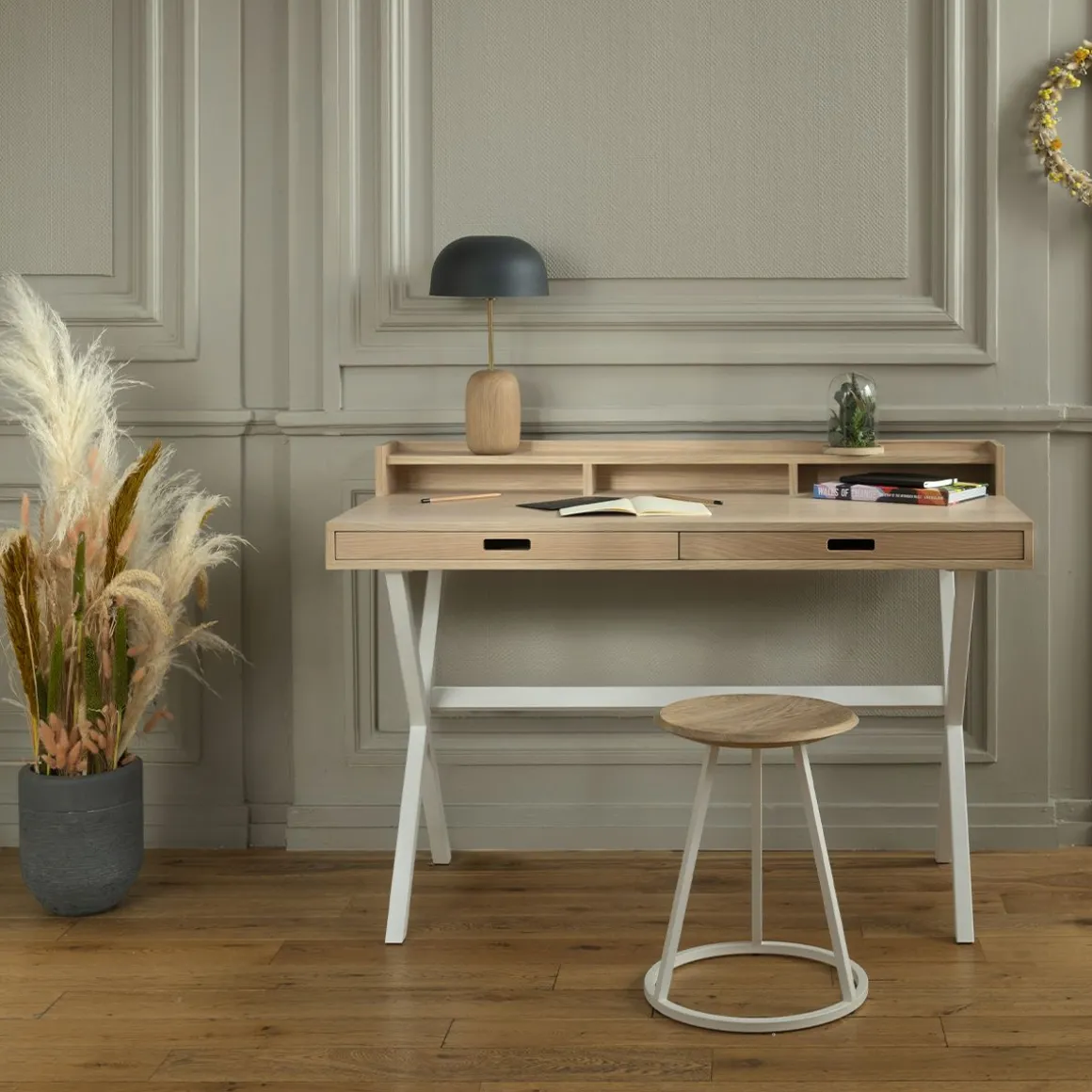 Hyppolite est un secrétaire, pratique et épurées. Il se mariera parfaitement avec votre intérieur grâce au piètement en métal coloré. Avec les casiers ainsi que les trois tiroirs sous le plateau vous pourrez ranger et d’organiser.