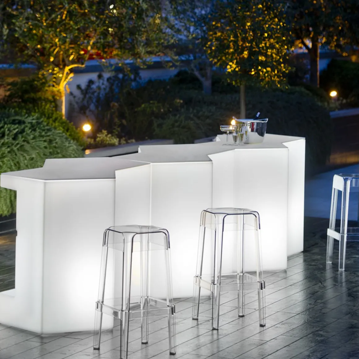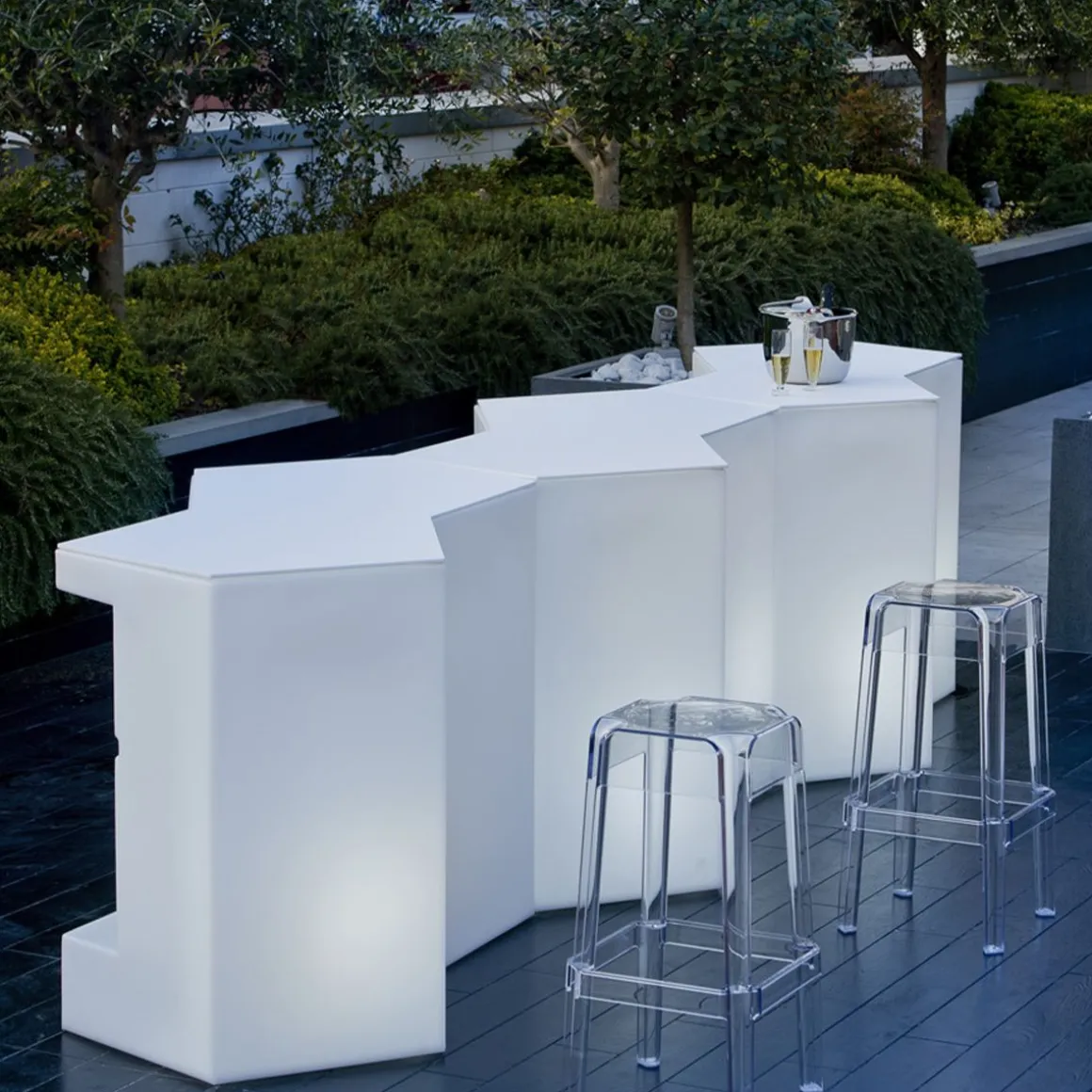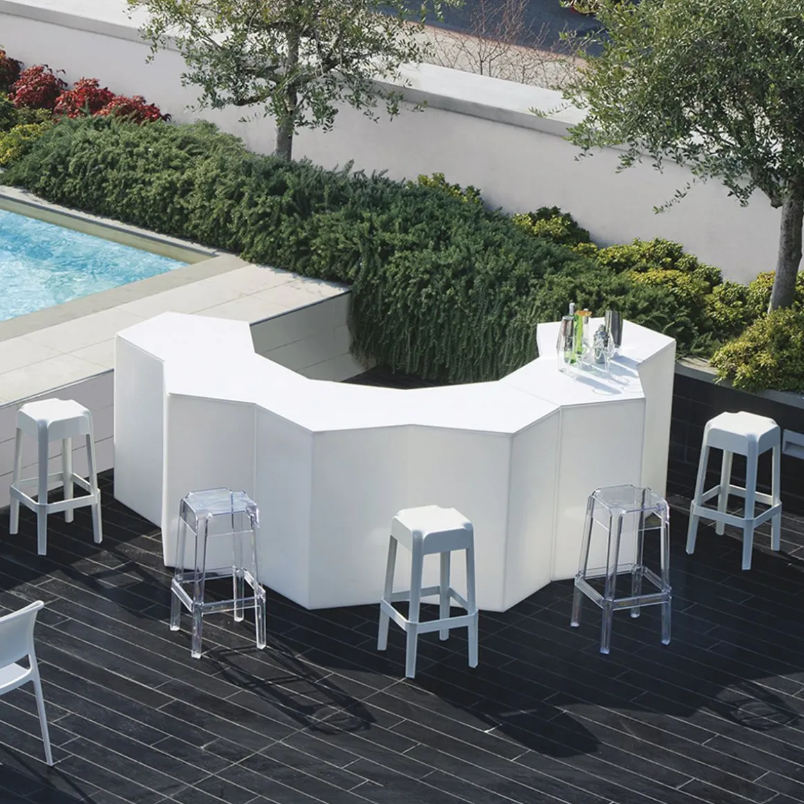Comptoir de bar modulaire ou table haute pour buffet, Iceberg est idéal pour le bar, le bar en plein air, à côté de la piscine, à la plage, en jardin pour l’apéritif ou pour le snack. Il est en polyéthylène à haute densité, injecté en roto-moulage.