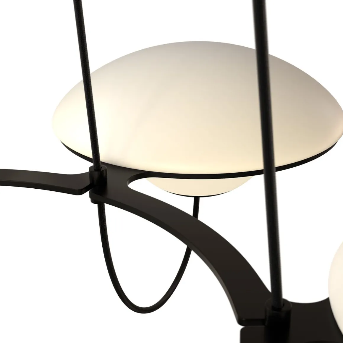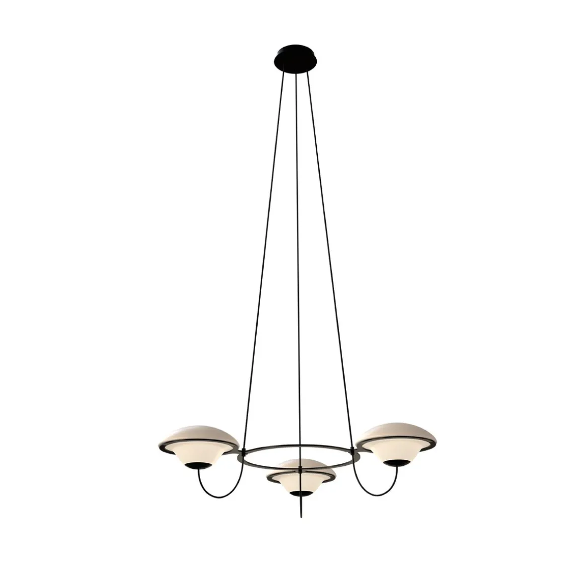Avec ses lumières « ufoesques », le lustre In the Air créé par Douglas Mont, se revendique de ce répertoire où la fantaisie rétro-futuriste le dispute à une science-fiction nostalgique. Voir et revoir les comics américains ou les films hollywoodiens de série B envahis de soucoupes volantes pour évaluer l’empreinte de cet arsenal lumineux fonctionnant par flotte de trois ou six aéronefs. Lumineux, biomorphique, posé sans ancrage sur des cercles métalliques, à l’instar de quelques lumières totémiques des années soixante italiennes, In the Air se pose en équilibre spatial, profilé telle une aéro-station en lévitation opalescente. Deux poids, deux mesures selon le nombre de lumières, sans en modifier ADN et allure.