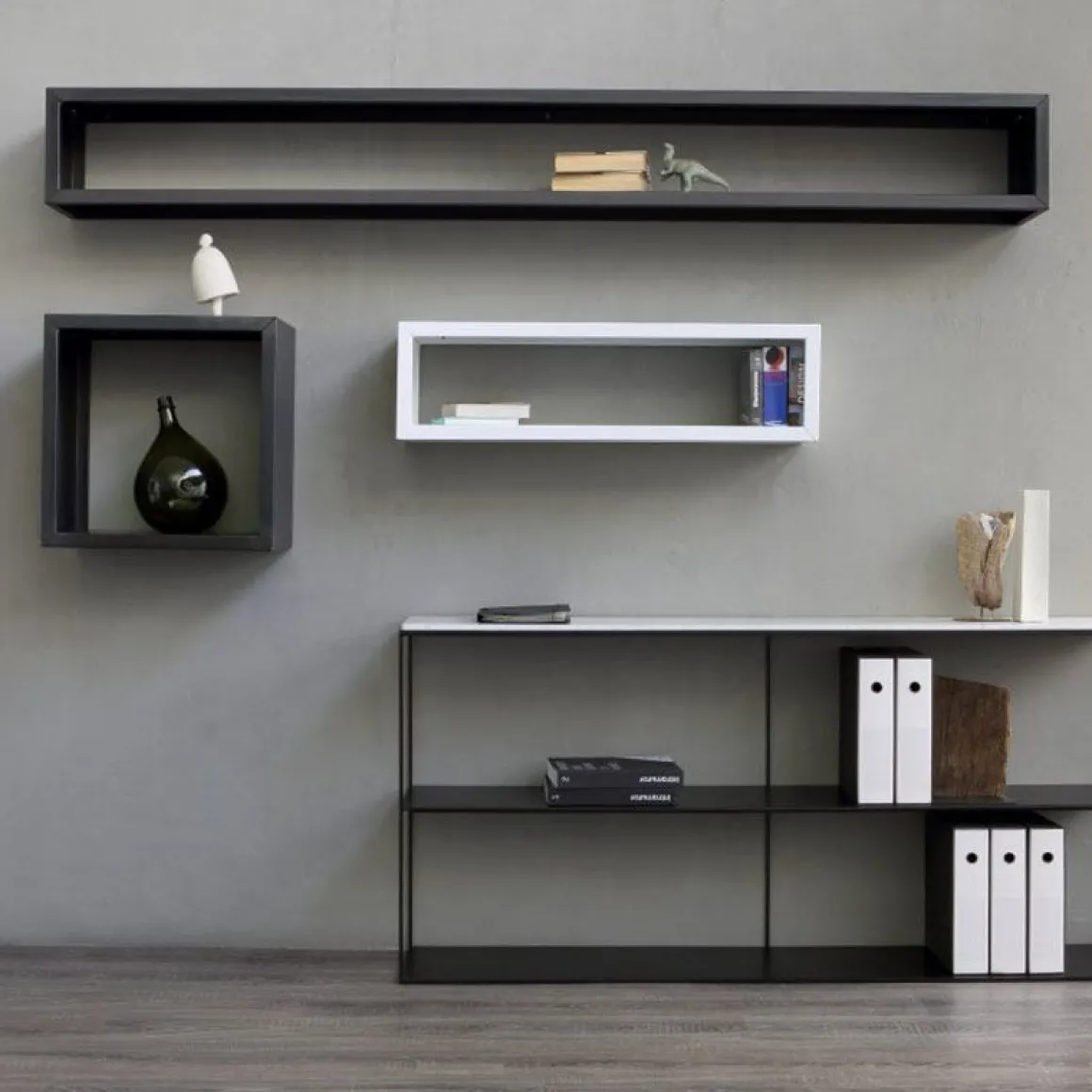 Étagère murale, structure en tôle d’acier naturelle découpée et courbée. Traitement phosphatation noir, fixage final avec cire d’abeilles.