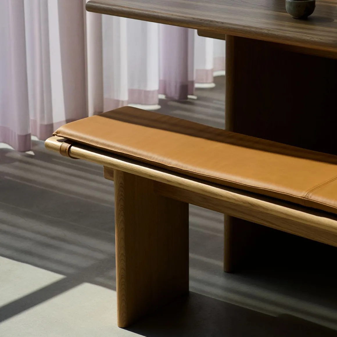 Pour ajouter un niveau de confort supplémentaire au banc Ita, un coussin d’assise sur mesure a été développé dans un cuir cognac riche. Avec des sangles discrètes et élégantes, le coussin est facile à attacher et à détacher du banc tout en faisant une référence subtile aux ceintures Obi japonaises que l’on trouve sur les kimonos.