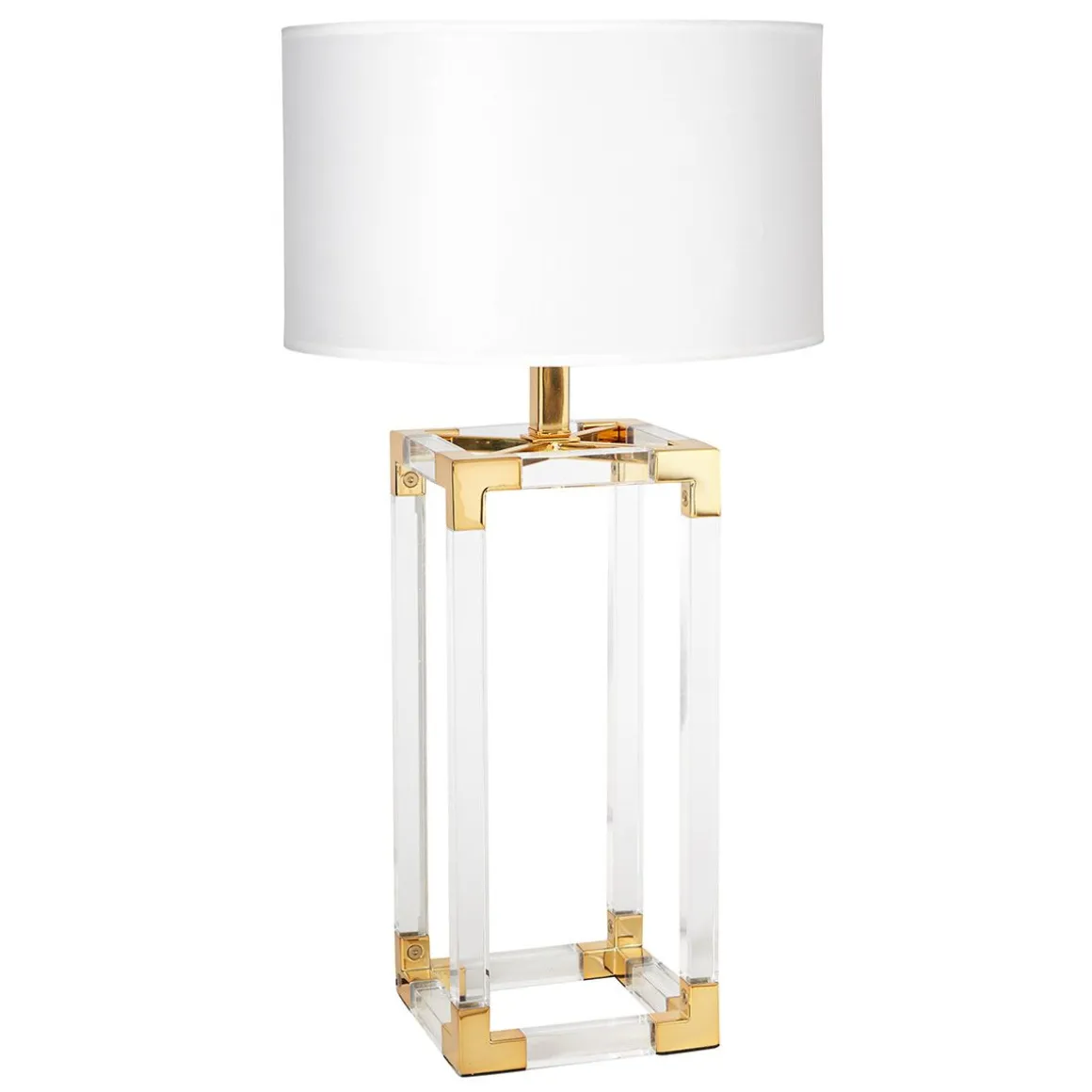 Le mélange parfait de simplicité et de glamour, moderne et traditionnel. Cette lampe de table à colonne Jacques présente une structure cristalline avec des coins en laiton brossé surmontés d’un abat-jour blanc soyeux.