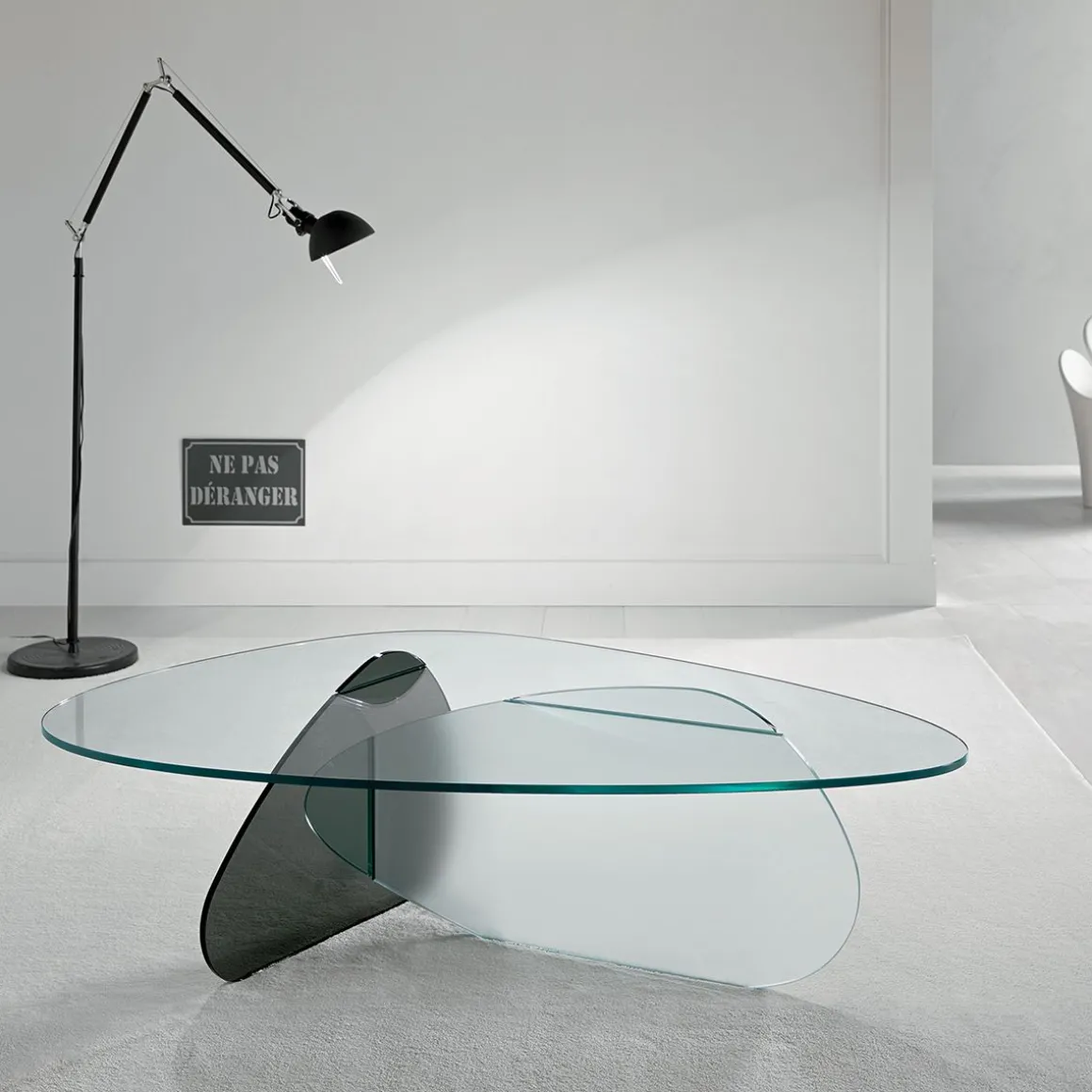 Trois plateaux de verre qui semblent se croiser forment cette table basse composée de trois verres différents : fumé, dépoli et transparent. Haut disponible en deux tailles.