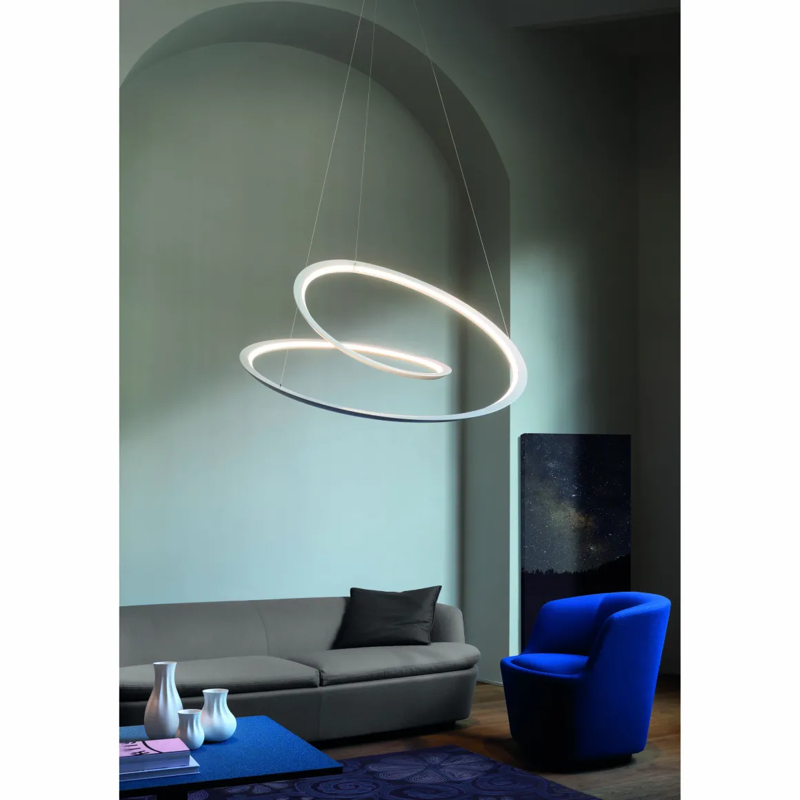 Suspension en aluminium vernis epoxy. Disponible en blanc ou noir mat. Sa lumière diffuse et confortable est un véritable plaisir pour les yeux.