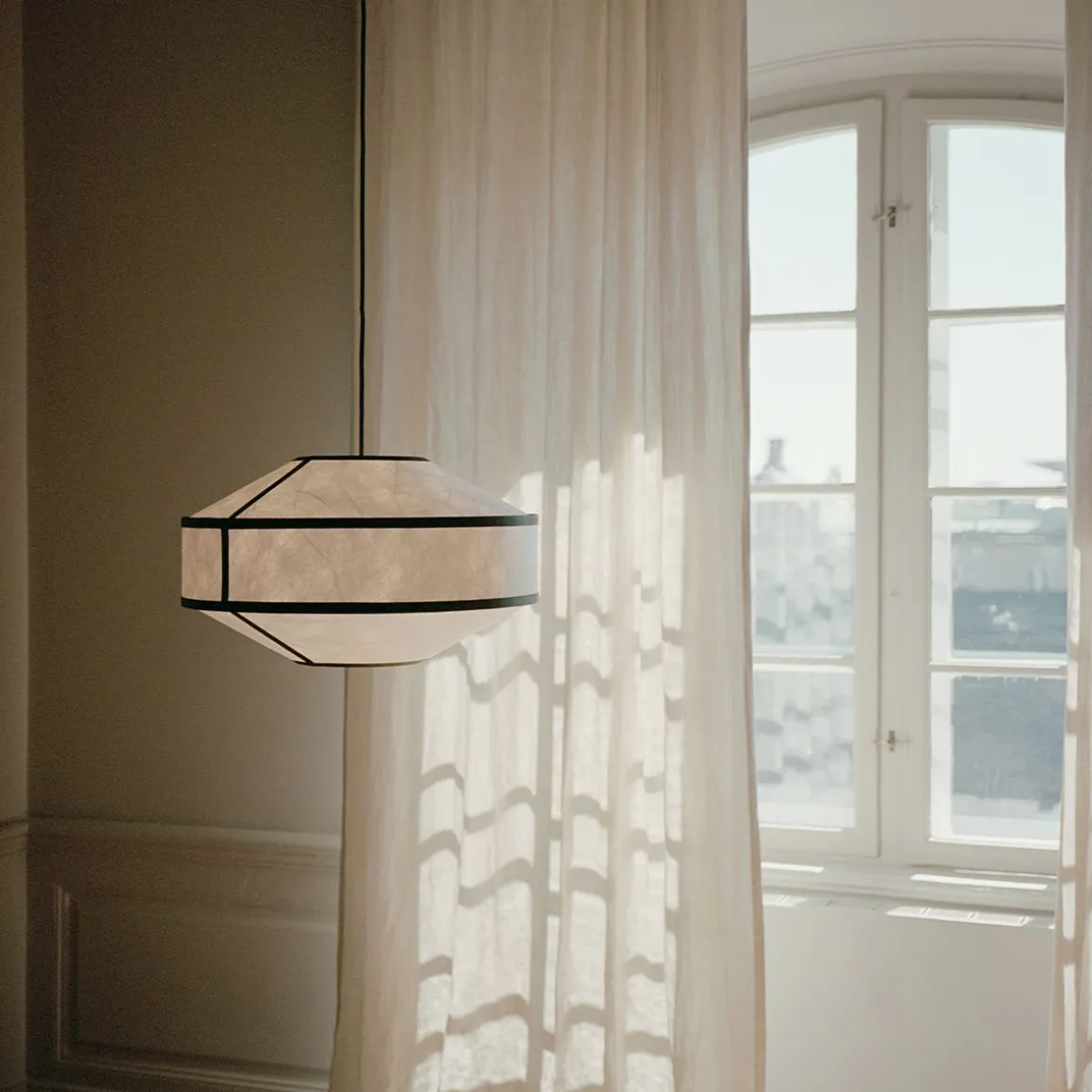Kite est une œuvre de proportions et d’abstraction, mêlant des silhouettes pures et géométriques à une matérialité lisse et texturée. Les mêmes éléments structurels sont adaptés en trois tailles différentes, chacune faisant écho à l’autre comme un conte qui se modifie subtilement à chaque récit. Un ruban adhésif délicat contourne les silhouettes, un raffinement technique qui enrichit la profondeur et le contraste. Qu’elles soient exposées ensemble ou séparément, les lampes suspendues Kite servent d’élément sculptural lumineux.