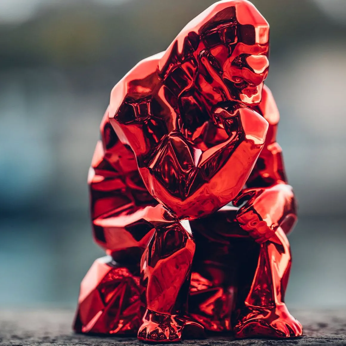 Le concept Born Wild© de Richard Orlinski soulève la question philosophique de la différence entre l’homme et l’animal. Choisissant le Kong, le plus humain de ses animaux, le sculpteur lui donne l’attitude du Penseur, en hommage à Rodin. Contrairement à l’original dont la musculature exacerbée contraste avec une attitude pensive, l’artiste minore la puissance physique du gorille pour le magnifier en penseur. Découvrez cette reproduction avec l’emblématique couleur Rouge Orlinski !