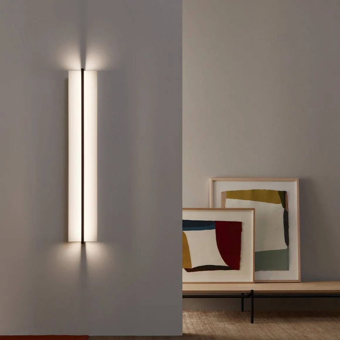 Offrant un cadre lumineux, l’applique Kontorno met en scène avec élégance sa source lumineuse linéaire. Cette applique de grande taille est définie par un élégant cadre noir incrusté de LED. Associée à un diffuseur en verre opalin soufflé à la main ou à un réflecteur métallique arrondi, elle équilibre les volumes épurés au sein d’une architecture géométrique et graphique. Grâce à son diffuseur cylindrique en verre, la lampe Kontorno diffuse une lumière chaude à 360 degrés, comme celle d’un feu. Associée à la plaque incurvée du réflecteur, elle crée une ambiance lumineuse immersive.