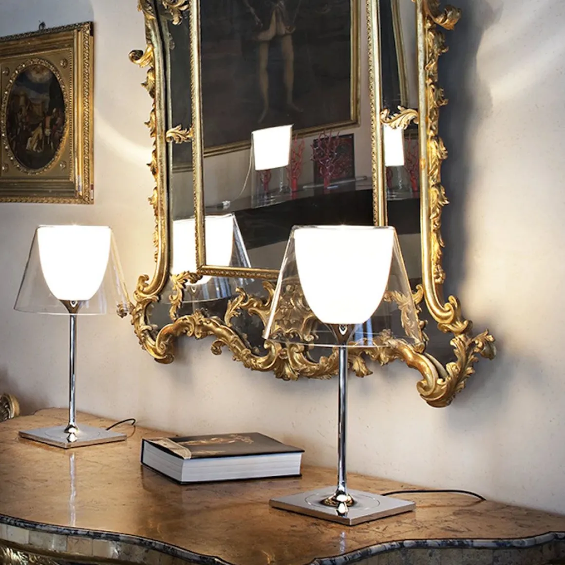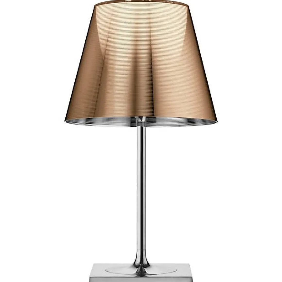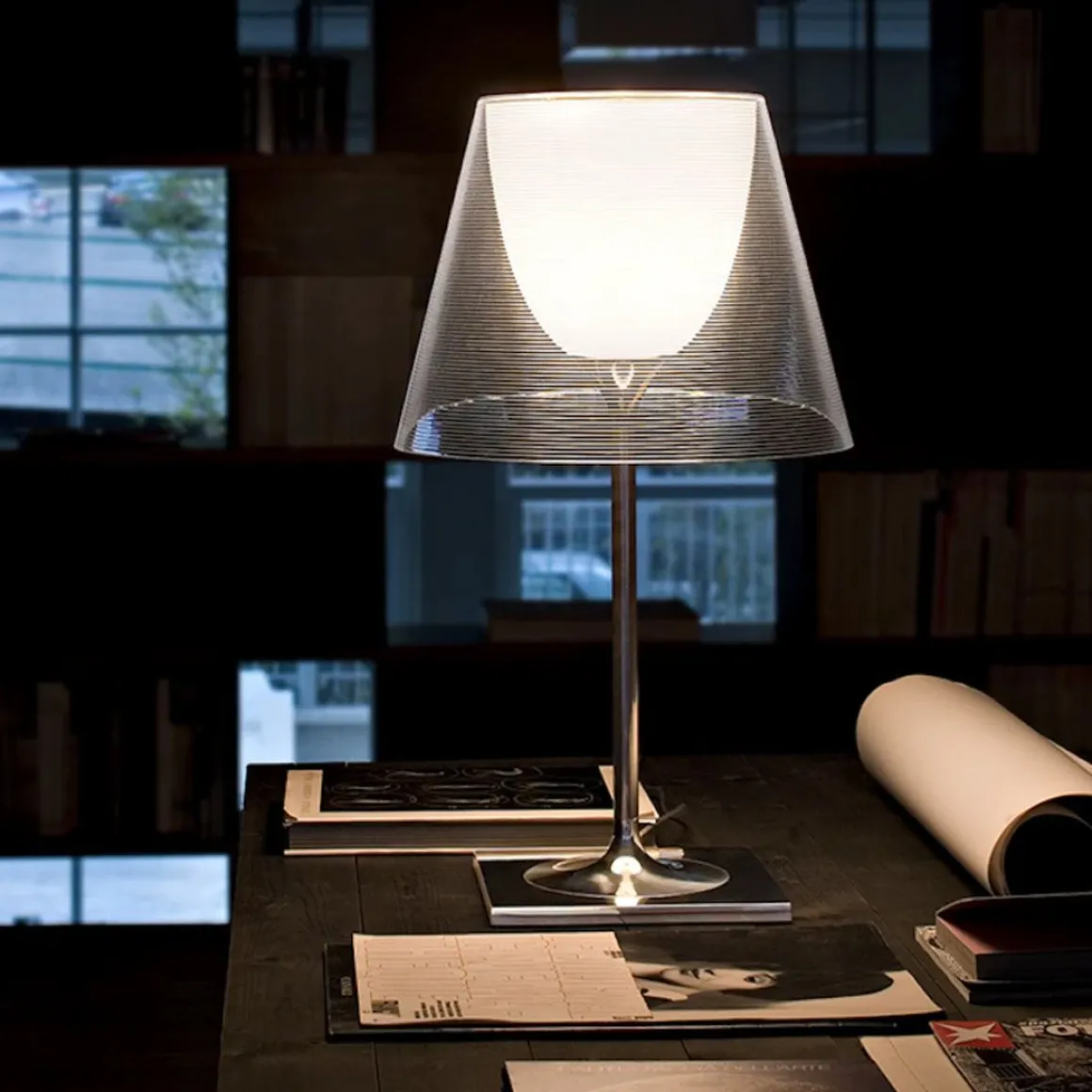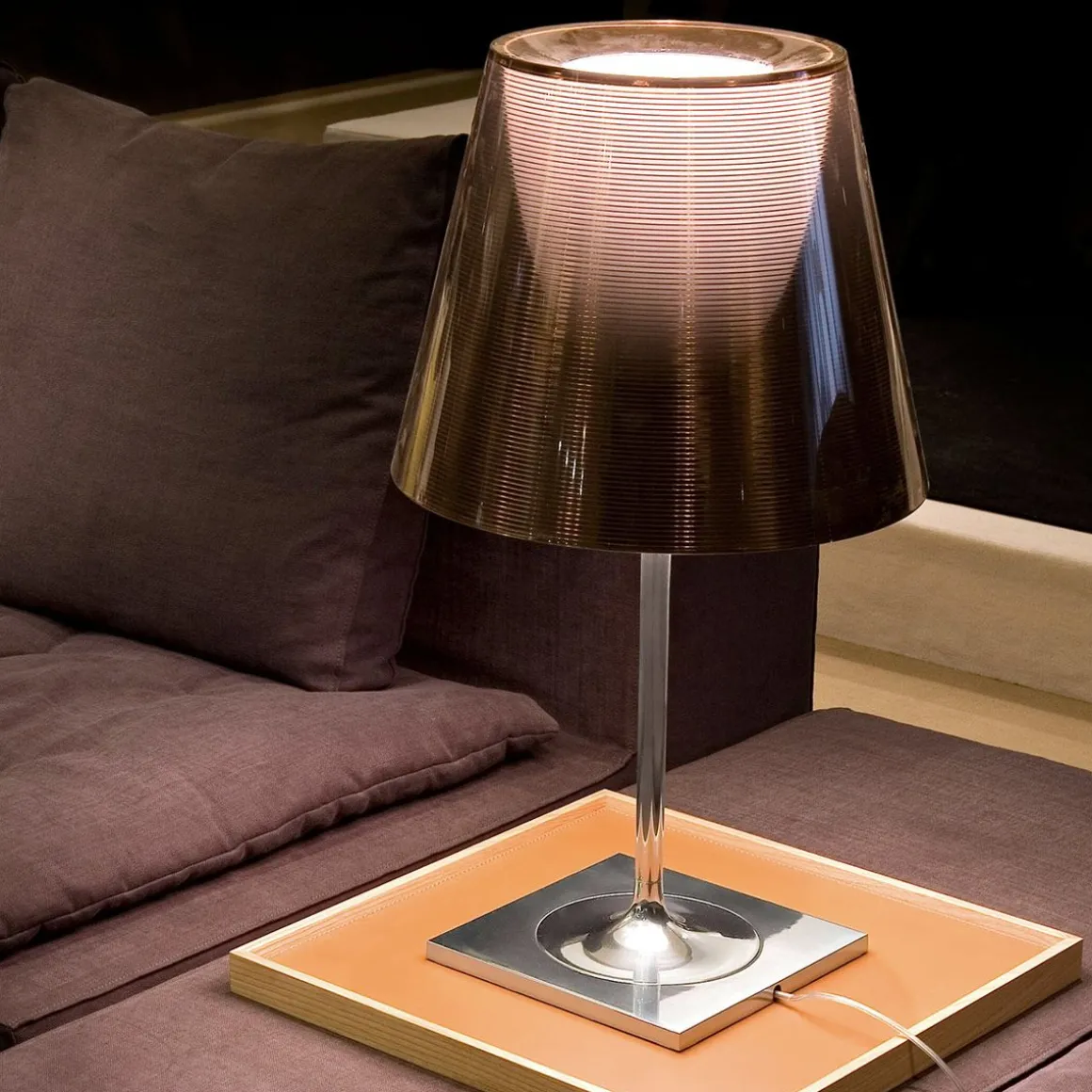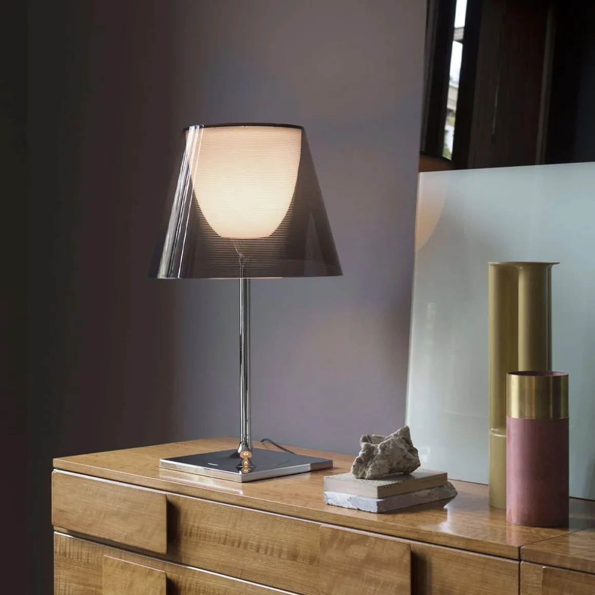 Ktribe T2 est une très belle lampe de table crée par Philippe Starck. Sa ligne est soulignée par le contraste des matériaux : la force de l’aluminium présent dans la base contraste parfaitement avec la douceur et l’arrondi de l’abat-jour. La lampe séduit par ses jeux de lumière : lorsque la lampe est allumée, le diffuseur extérieur laisse apparaître le diffuseur intérieur qui n’était pas visible, un joli dôme blanc se dessine (pour la version chrome et bronze). KTRIBE émet une lumière diffuse et possède un variateur d’intensité.