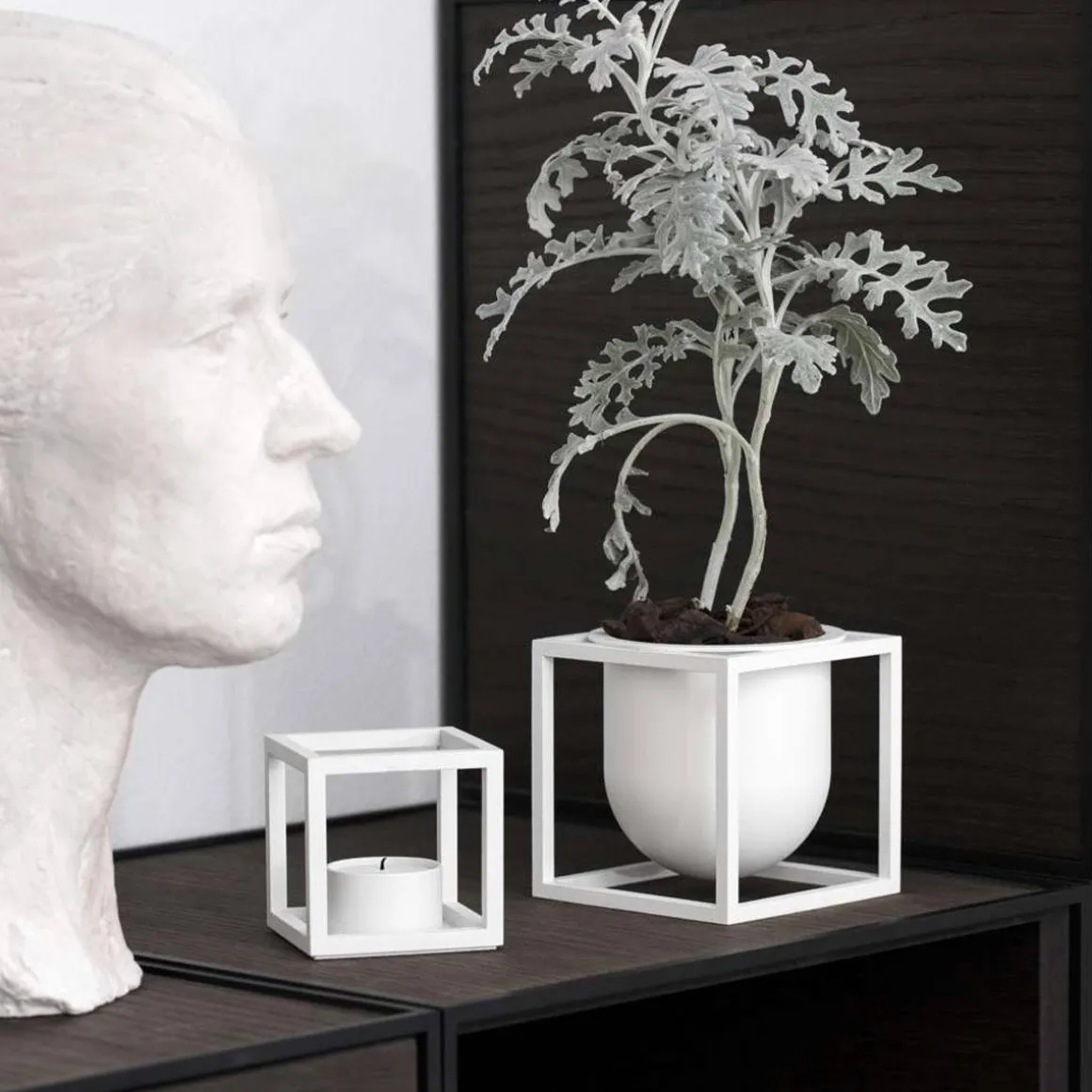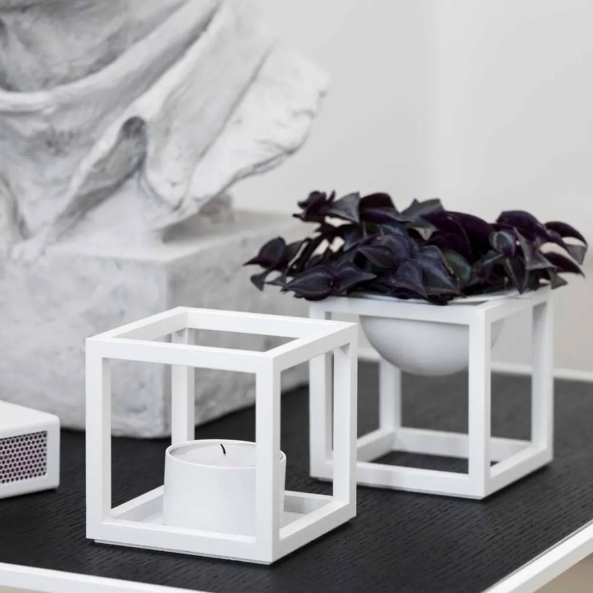 La bougie chauffe-plat Kubus T est ajoutée à la collection Kubus en 2018, conçue par Sarah Abbondio. Rigueur simpliste et graphique sont les maîtres mots décrivant le bougeoir. Choisissez les versions classiques à revêtement en poudre, le cuivre bruni brut, qui au fil du temps s’assombrit magnifiquement, le laiton ou la belle version en nickel brillant, qui est chaud et unique dans son éclat – ou combinez-en plus pour une belle nature morte sculpturale sur le rebord de fenêtre ou sur la table du dîner.