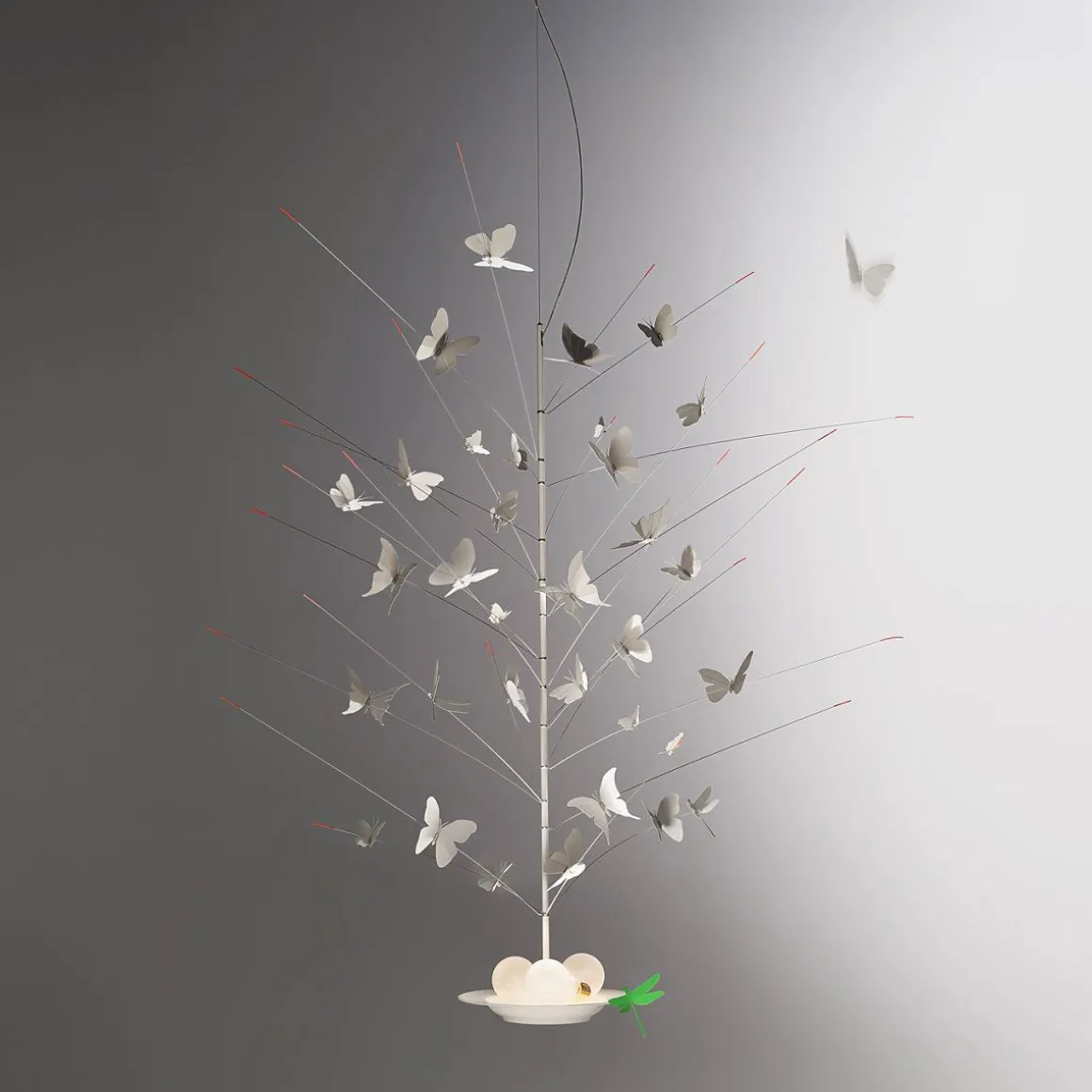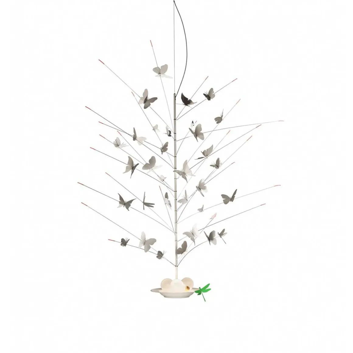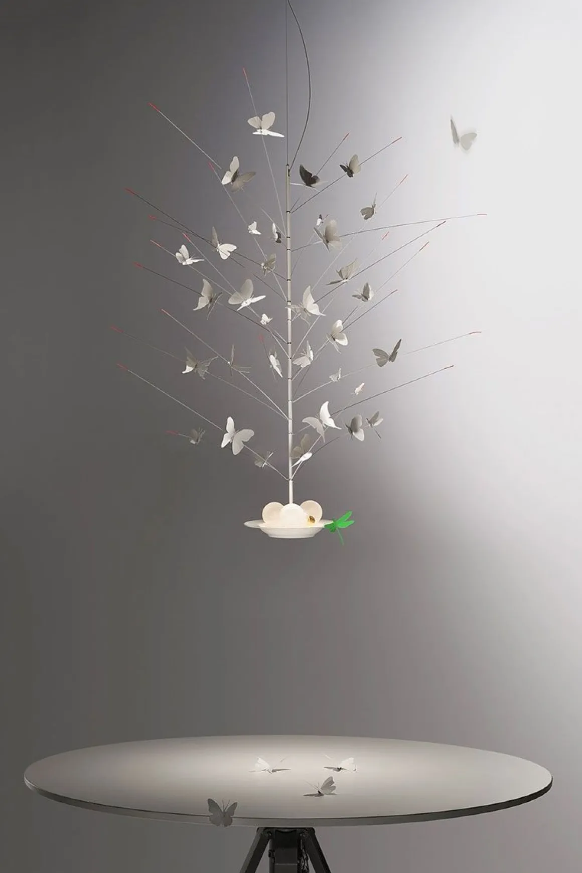 La Festa delle Farfalle de Ingo Maurer. La festa della Farfalle de Ingo Maurer est une suspensions représentant 34 papillons et une libellule en papier. 3 ampoules, gisant comme des poires sur une assiette. Des LEDs intégrés dans l’assiette en porcelaine rayonnent vers le haut et vers le bas.