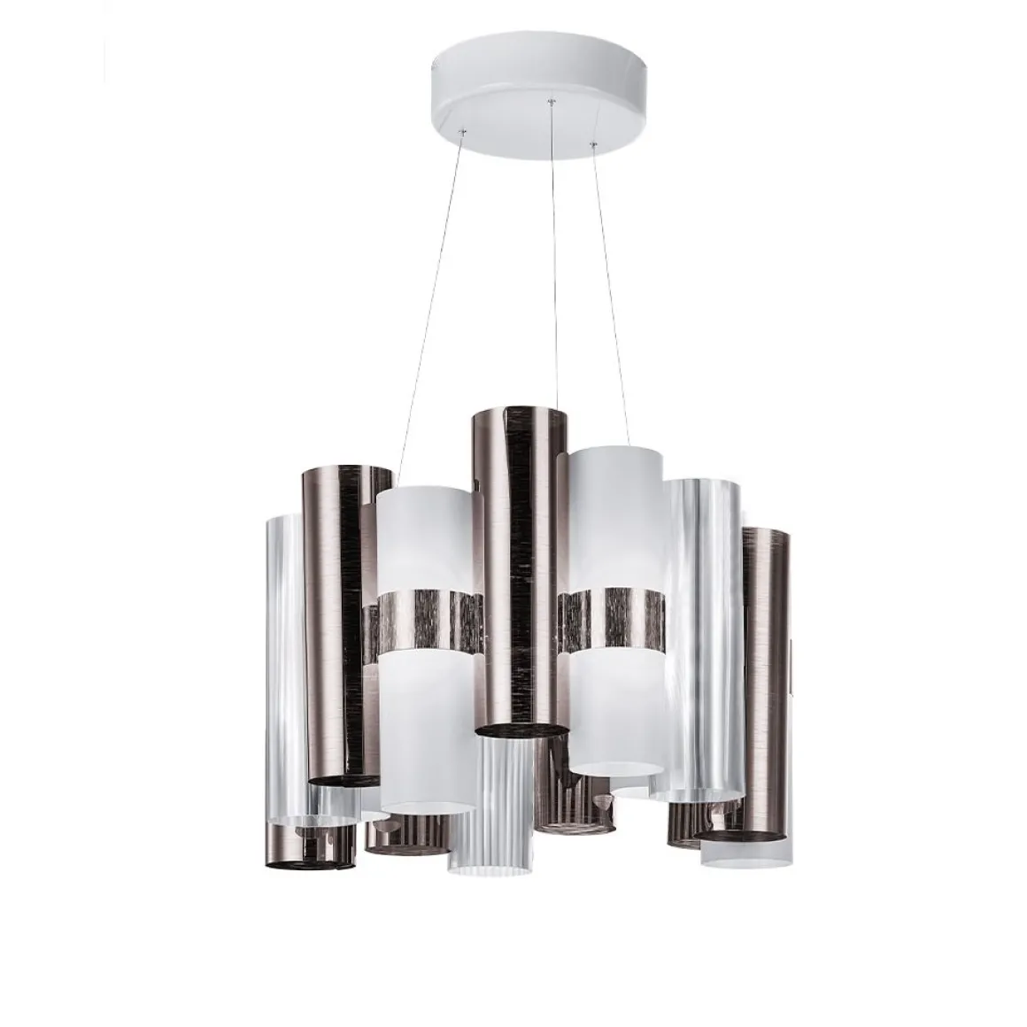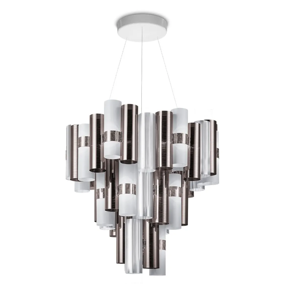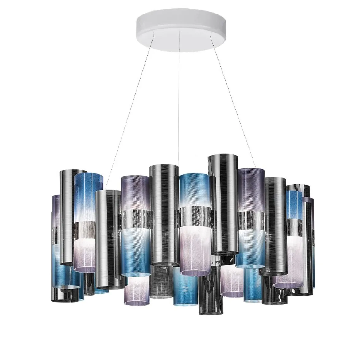 Elle anime l’espace avec élégance et spontanéité, réveillant grâce à sa forme et à ses tonalités les souvenirs d’une histoire de divas et de projecteurs. Les cylindres lumineux à LED sont disposés à des hauteurs variables autour d’un anneau central, et alternent la tonalité des métaux précieux par transparence avec celle des tons pastel. Le brossage du revêtement métallique laisse le soin à la lumière de suggérer le décor.