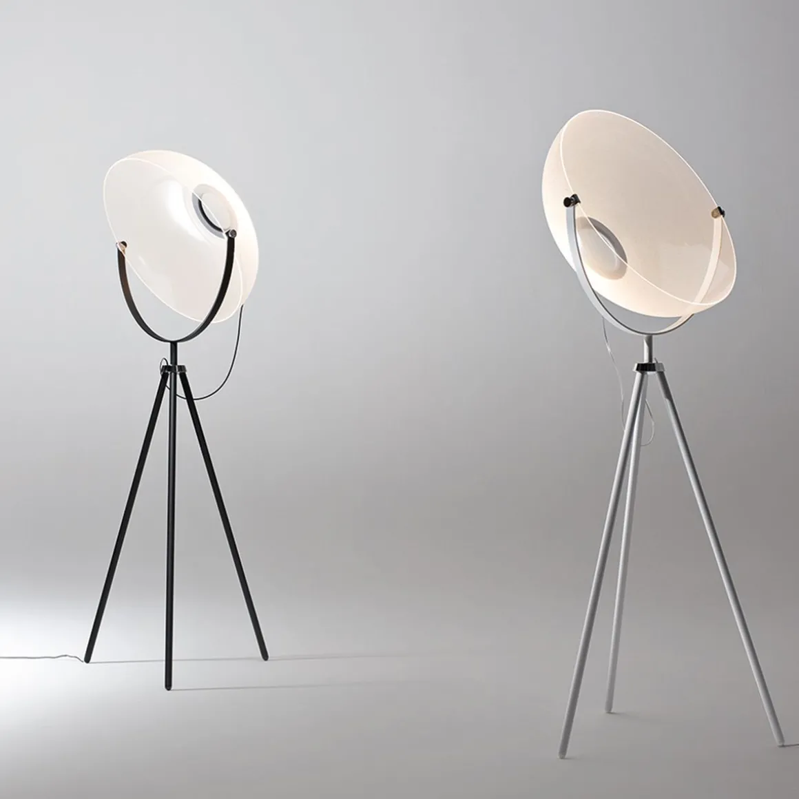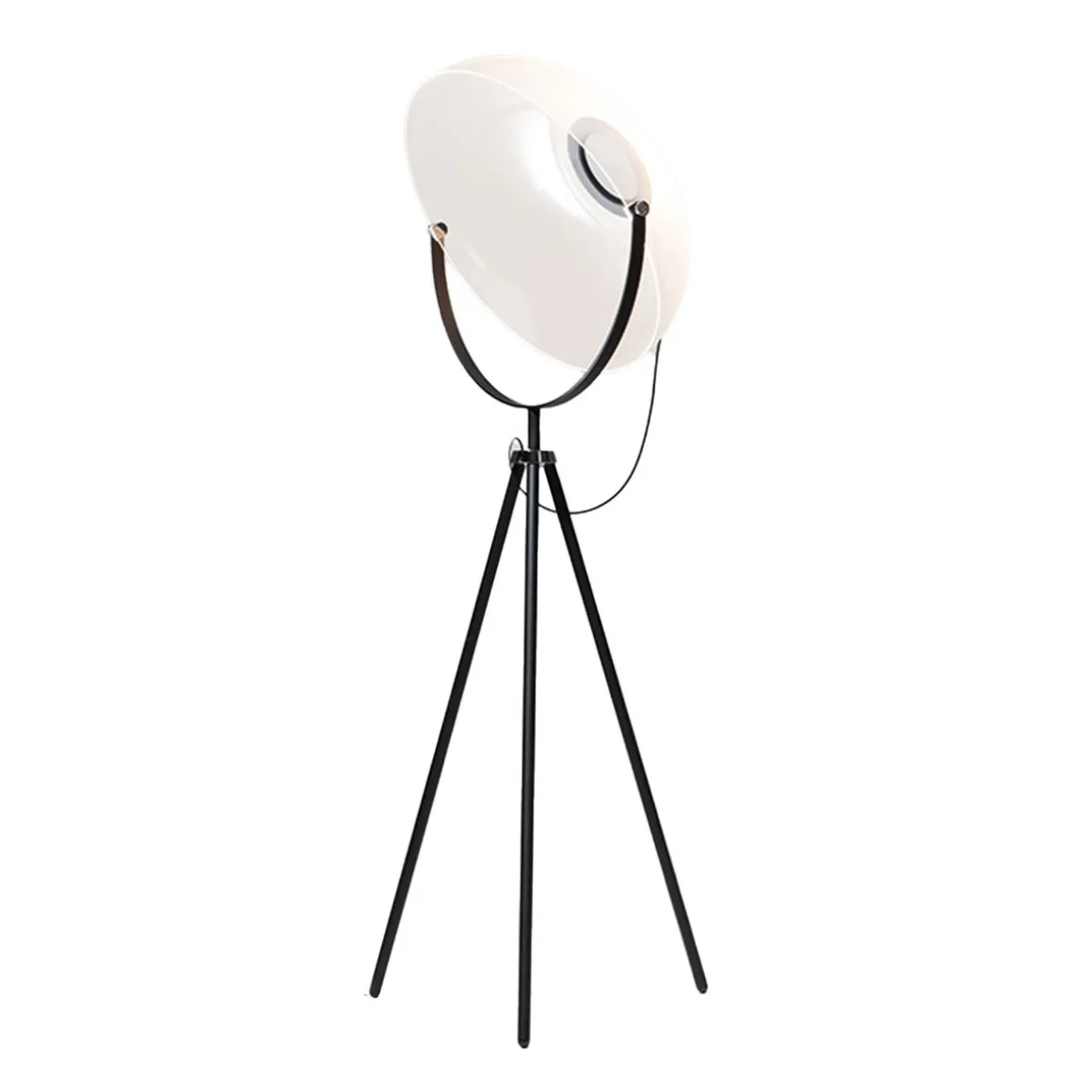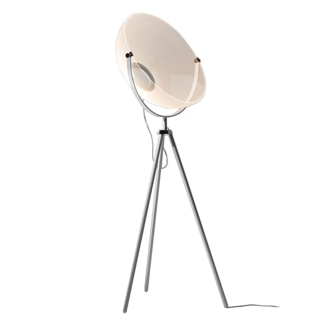 Matériaux : Diffuseur transparent en PMMA thermo-soufflé. Anneau central en aluminium. Trépied en métal.