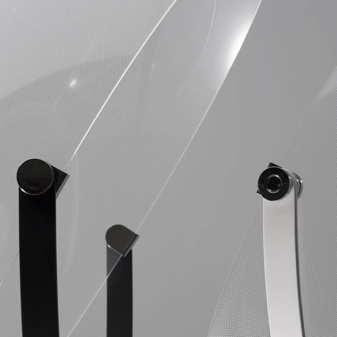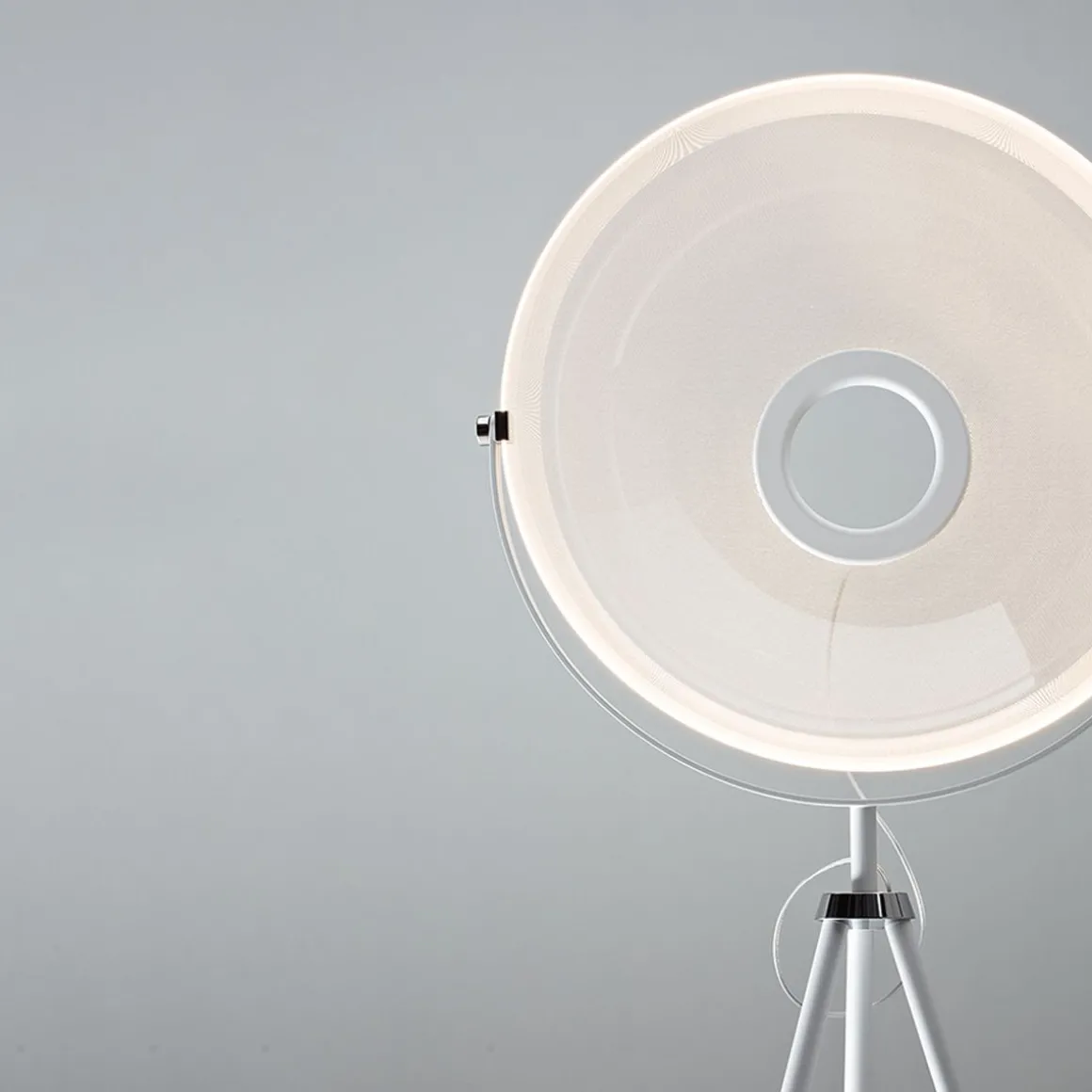 Lorsque Demì Moon est éteinte, elle devient une grande coupole transparente. Grâce à la technologie exclusive Opti-Light™, lorsqu’elle est allumée, le bord inférieur et les milliers de micro-incisions laser de la surface diffusent une lumière douce et homogène. La coupole est fixée à un trépied. Un système de déverrouillage pratique permet de faire pivoter la coupole.