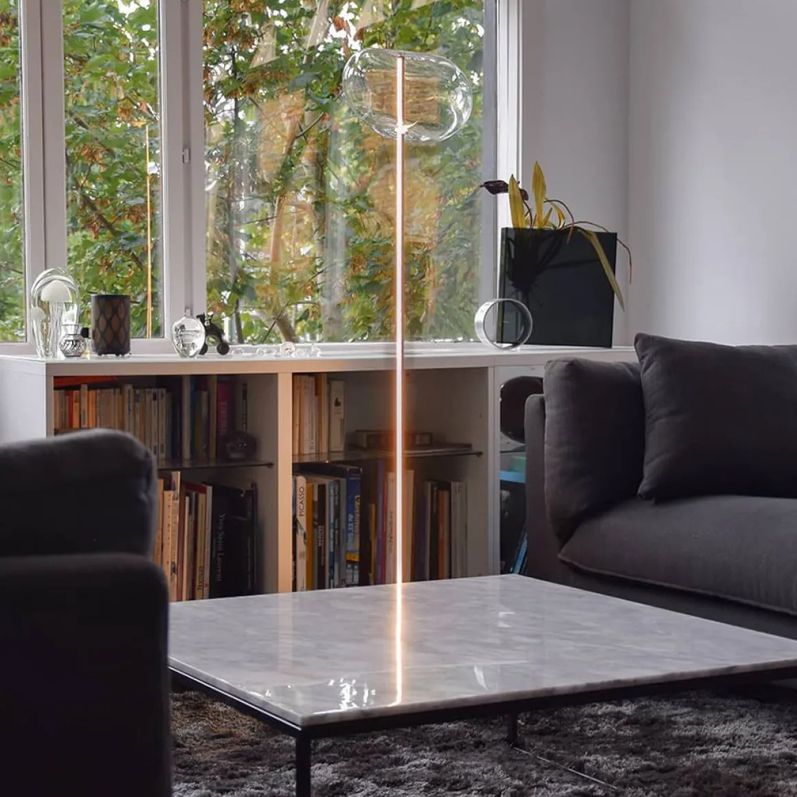 Le lampadaire design G-222 combine un style minimaliste et aérien. Le lampadaire à éclairage variable se compose d’un tube en aluminium rainuré d’où s’extrait une lumière discrète et fonctionnelle et d’un galet de verre italien soufflé à la bouche. Ce galet interchangeable s’ajuste selon vos envies mais également aux ambiances de votre intérieur.