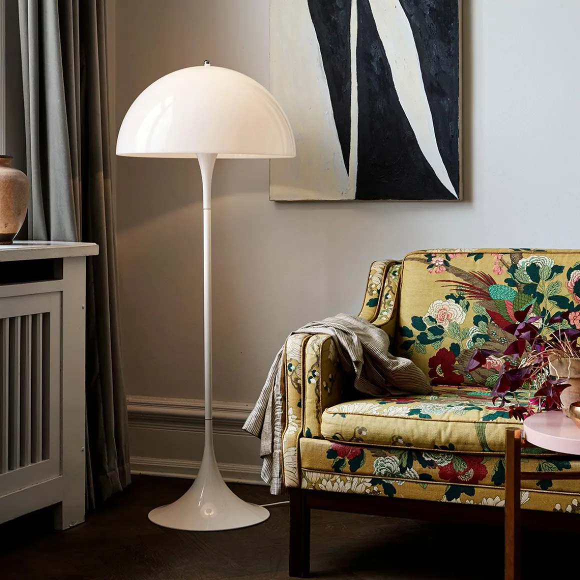 Créé en 1971, Panthella est l’une des créations les plus célèbres de Verner Panton. Le principe d’éclairage de base visait à créer une lampe dont la base et l’abat-jour faisait office de réflecteur. La source lumineuse des lampes est cachée derrière un abat-jour hémisphérique en acrylique blanc laiteux et une base blanche en forme de trompette contribue à une superbe distribution de la lumière ainsi qu’à une forme bien équilibrée et organique. Panthella émet une lumière douce et agréable, dirigée vers le bas.