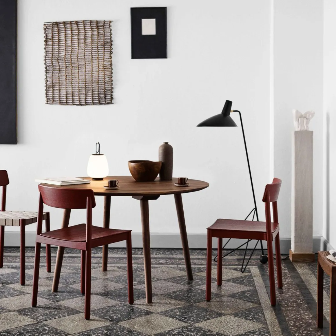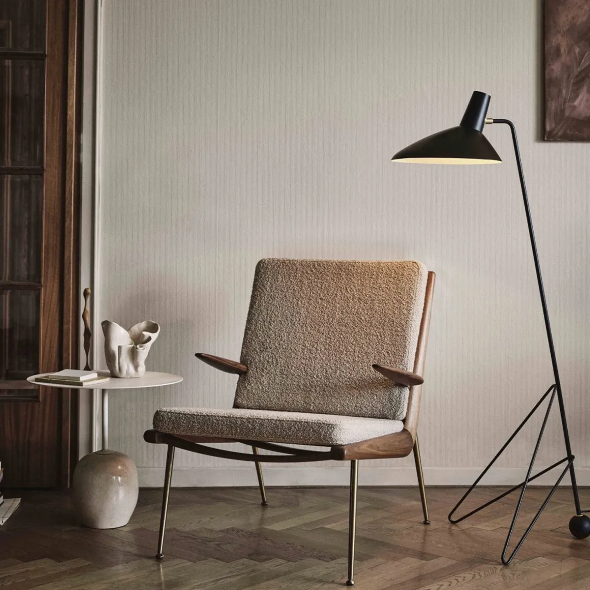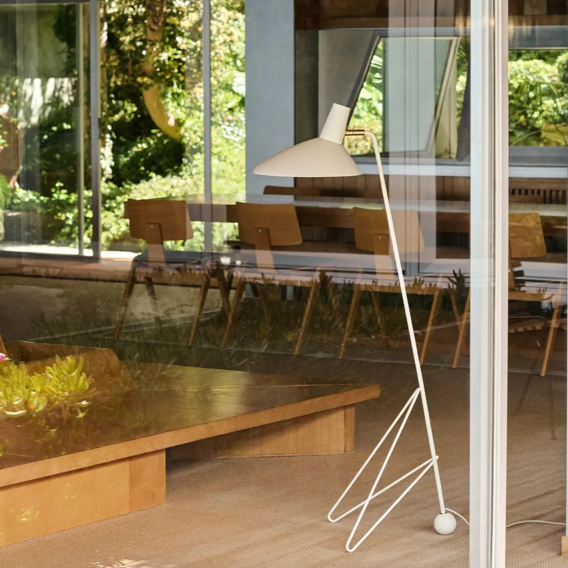 Le trépied de 1953 reflète le minimalisme épuré des maîtres anciens Hvidt & Mølgaard. Lampadaire construit en acier laqué avec des détails en laiton, il établit un équilibre délicat entre la sobriété de son design et la douceur injectée par les bords incurvés de sa base. Bien qu’il ait été conçu en 1953, c’est la première fois qu’il est en production.