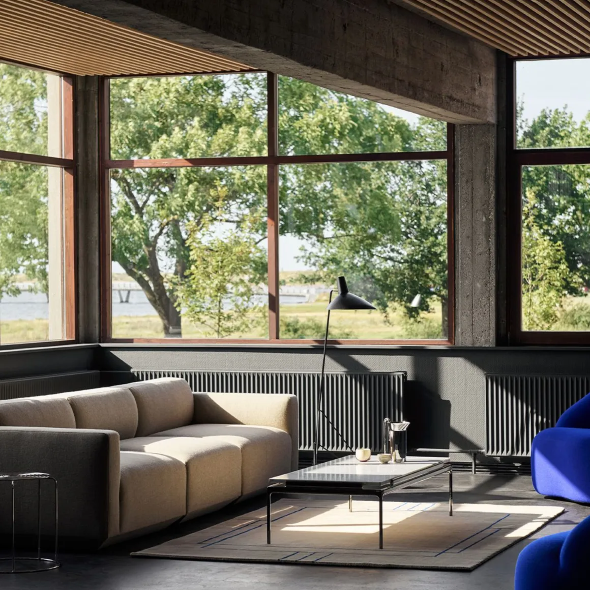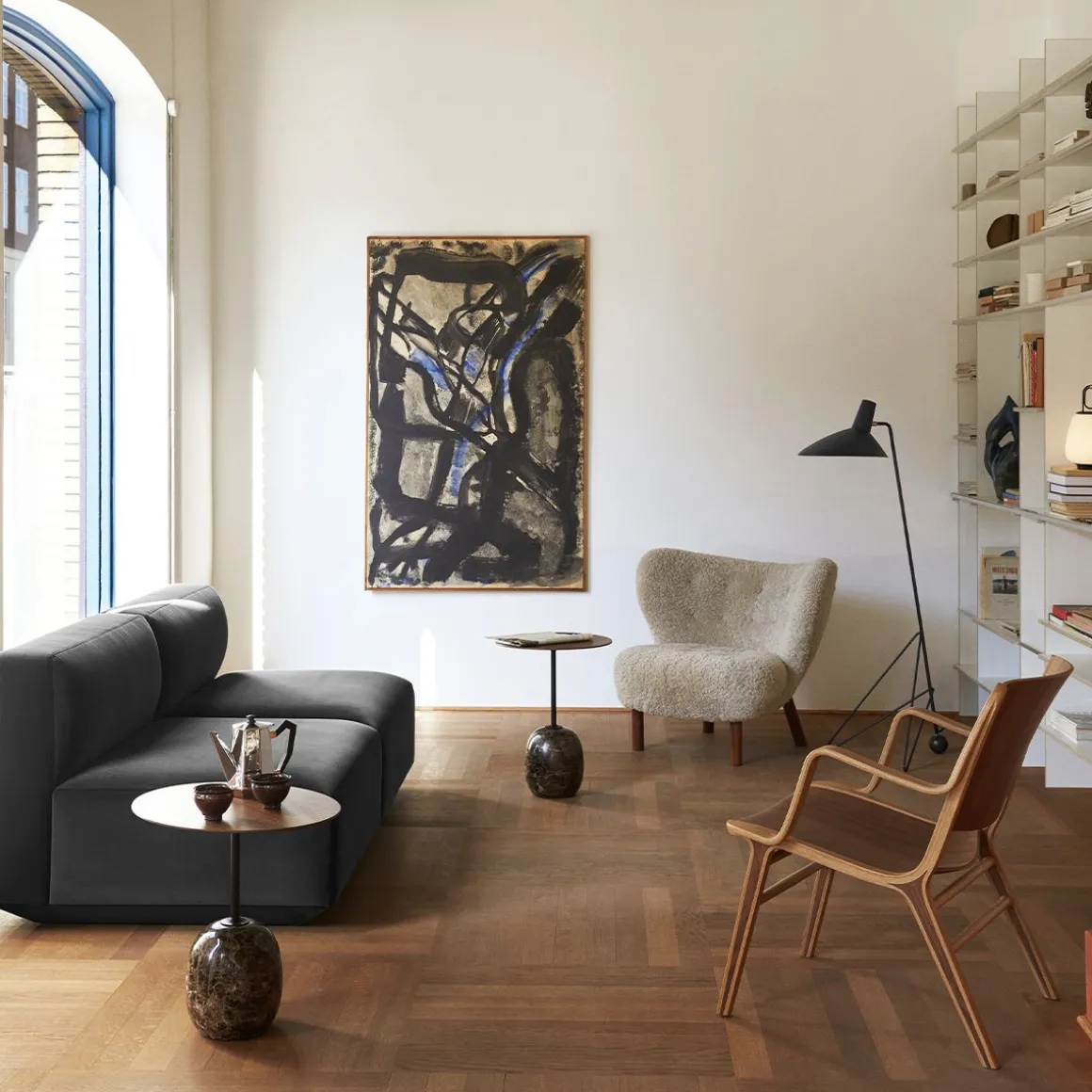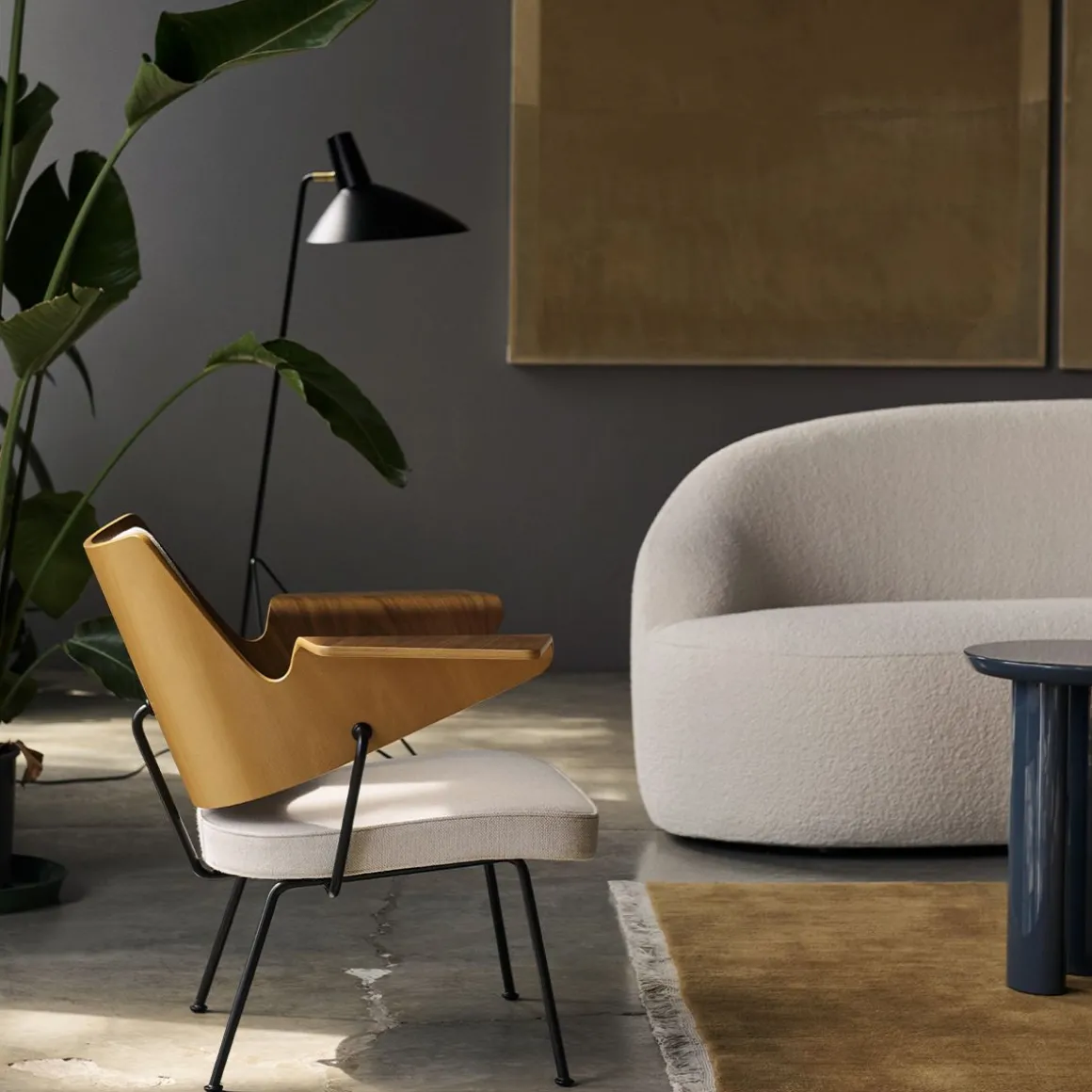 Le trépied de 1953 reflète le minimalisme épuré des maîtres anciens Hvidt & Mølgaard. Lampadaire construit en acier laqué avec des détails en laiton, il établit un équilibre délicat entre la sobriété de son design et la douceur injectée par les bords incurvés de sa base. Bien qu’il ait été conçu en 1953, c’est la première fois qu’il est en production.