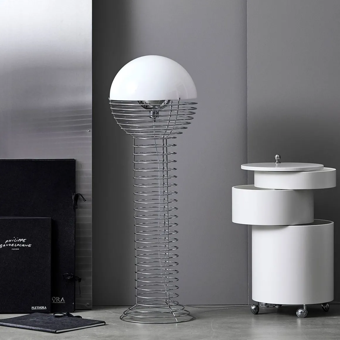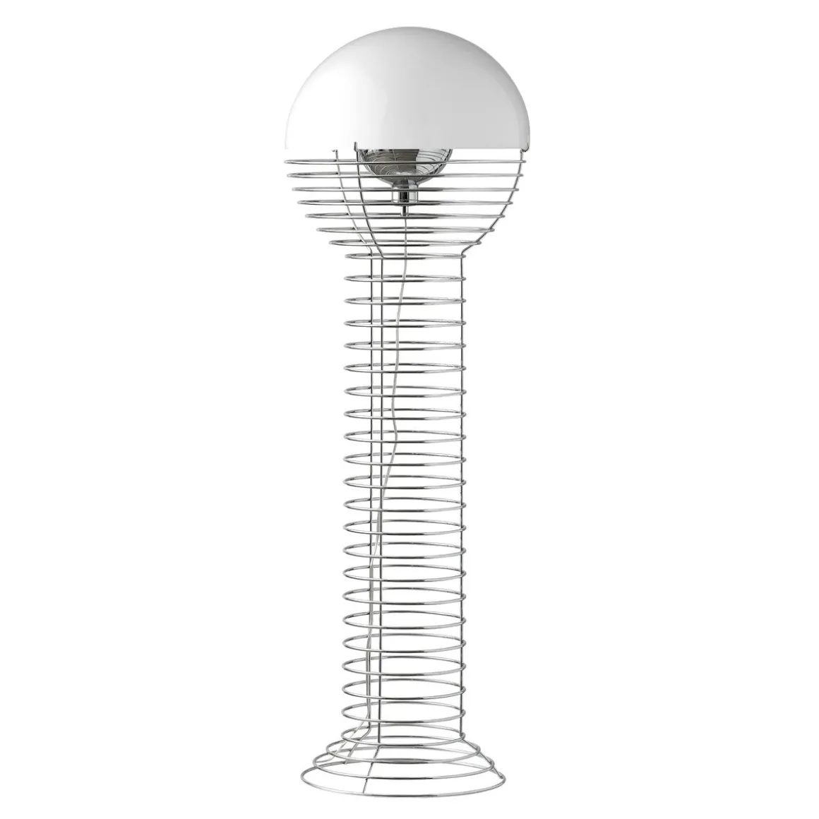 La lampe de table décorative Wire est définie par le cadre en fil d’acier chromé qui s’élargit au sommet pour soutenir l’abat-jour en plastique hémisphérique blanc. L’ampoule est contenue dans un petit réflecteur métallique également hémisphérique, qui guide la lumière vers l’intérieur de l’abat-jour. Le cadre en fil de fer confère au design un aspect distinctif, mais très léger et non intrusif, et l’abat-jour blanc offre beaucoup de lumière ambiante.