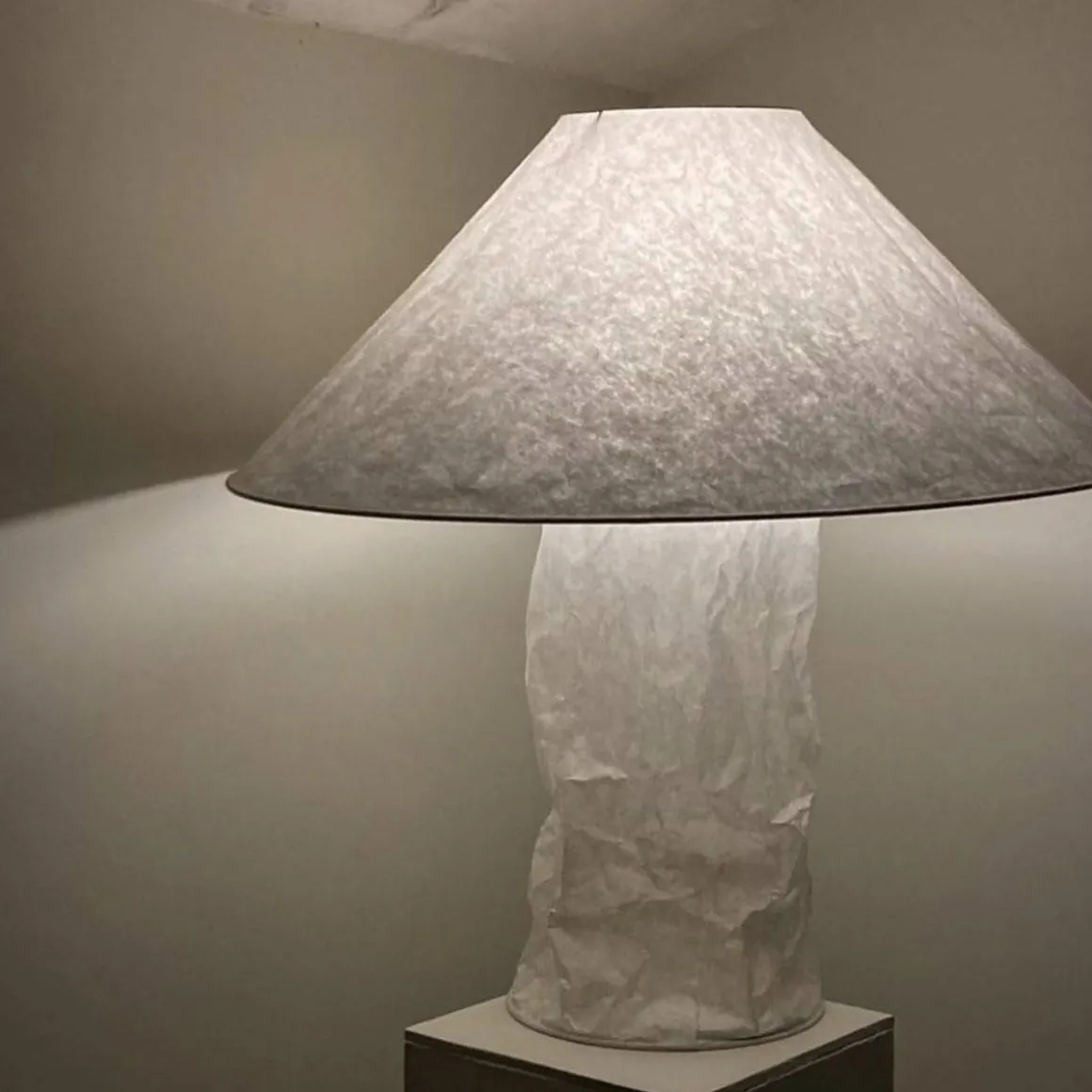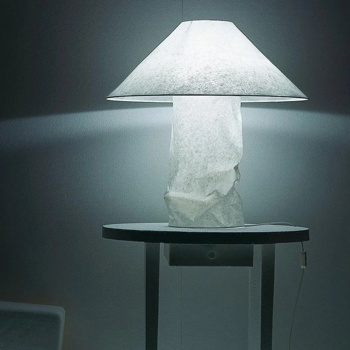 Papier japonais, métal. Lampampe fait partie d’une série de lampes simples en papier japonais qu’Ingo Maurer a élaborée à la fin des années 1970 / début des années 1980. Dans ce projet, il reprend la forme des abat-jour traditionnels tout en formulant une nouvelle esthétique. Les abat-jour sont fabriqués à la main dans notre production à Munich. Le papier produit une lumière douce et totalement non éblouissante. Le papier est légèrement froissé comme élément créatif voulu.