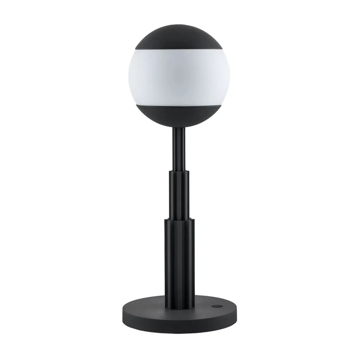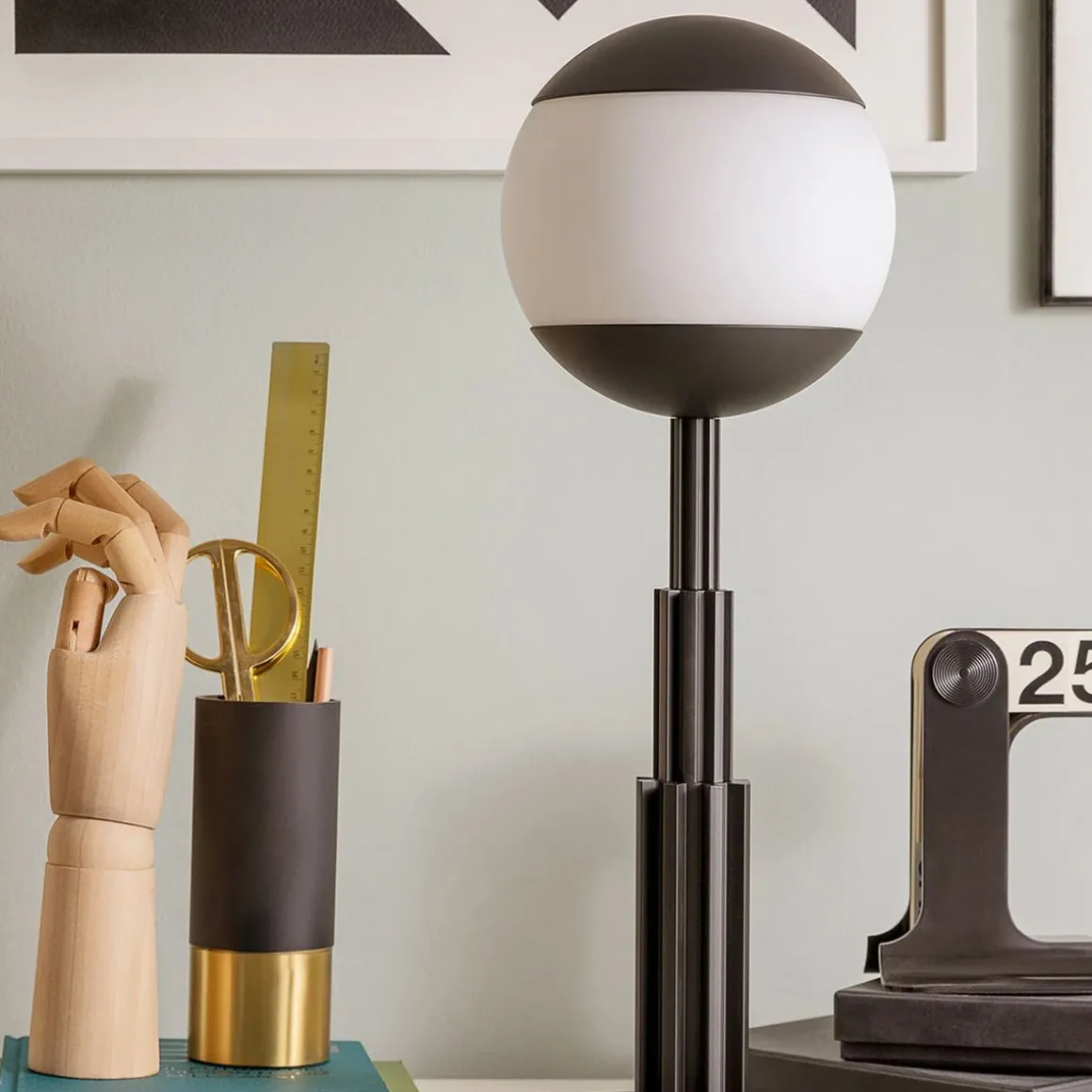 Matériaux : aluminium tréfilé peint, sphère en verre opale satiné, socle équipé d’un port Usb C, touche on/off et variateur de lumière tactile