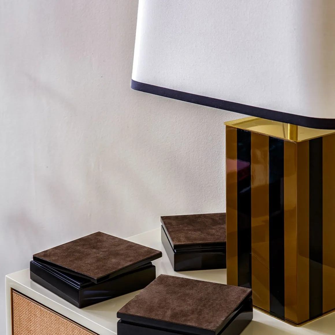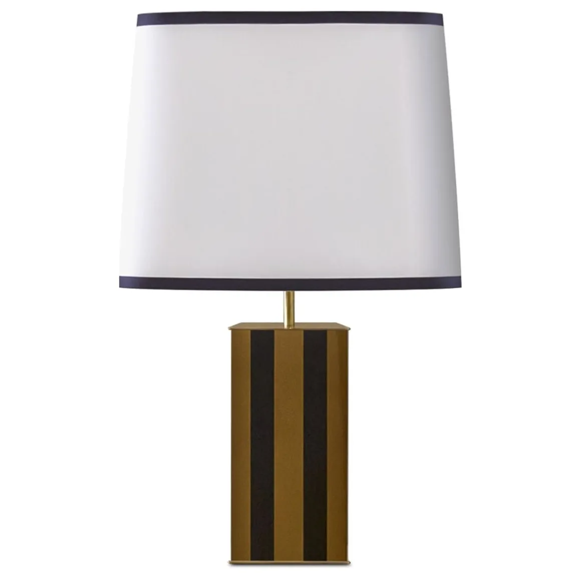 Laiton et laque bicolore noir et moutarde se marient à merveille dans cette lampe à poser, majestueuse et raffinée. Les rayures du pied sont rappelées sur l’abat-jour bordé de nois : l’effet d’optique est parfait et c’est là que l’esprit dandy entre à l’Élysée.