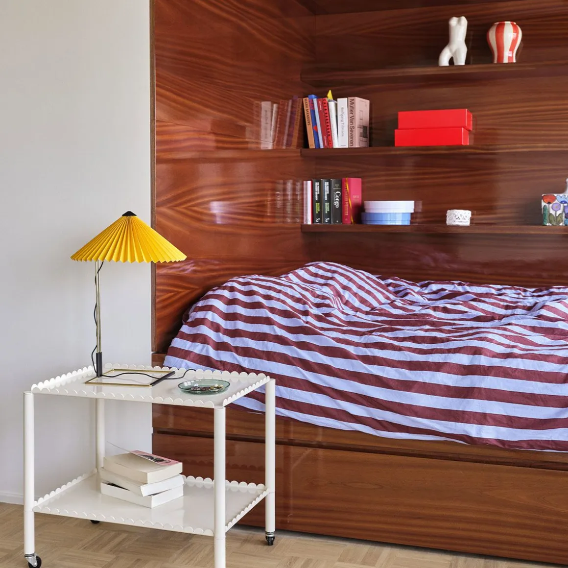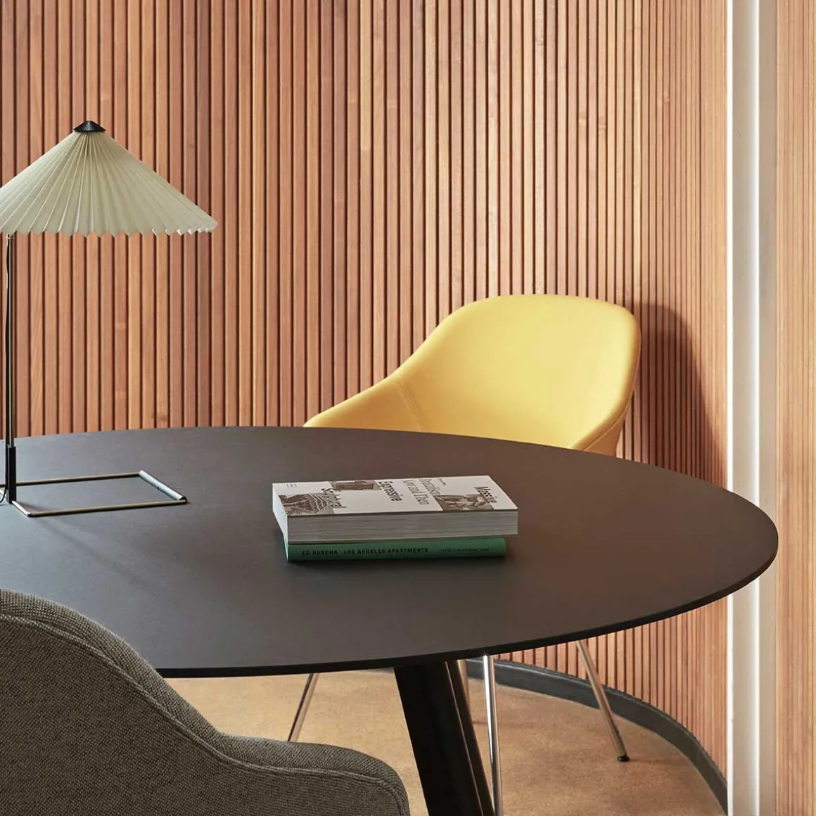 Lampe à Poser Matin de Hay. Conçue par Inga Sempé, la lampe de table Matin offre un design contemporain mais poétique, avec une construction qui allie délicatesse visuelle et robustesse physique. Le cadre en fil d’acier courbé est complété par un abat-jour en coton plissé dans une variété de couleurs vives. La source lumineuse est une LED intégrée, offrant une lumière diffuse qui est accompagnée d’un variateur numérique en ligne pour ajuster la puissance de la lumière si nécessaire.