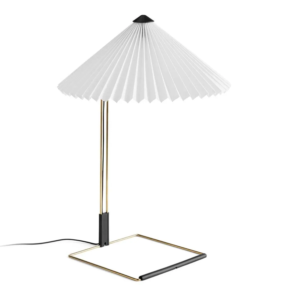 Matériaux : abat-jour tissu de coton laminé sur une feuille de PVC, base fil d’acier courbé, fonte d’acier et ABS moulé par injection