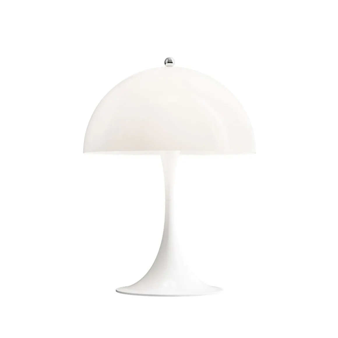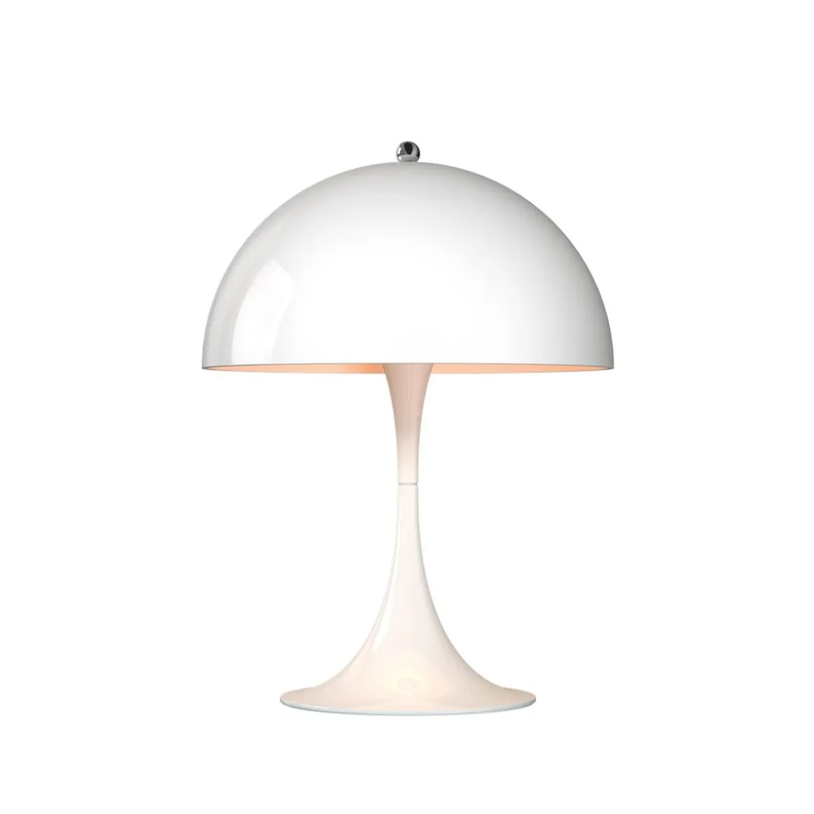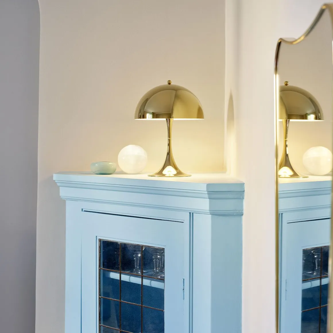 Panthella mini est une lampe designé par Verner Panton pour la marque Louis Poulsen. Le luminaire émet une lumière douce et feutrée. La version métallique dirige la lumière directement vers le bas, créant un éclairage doux et confortable grâce à un abat-jour peint en blanc à l’intérieur et à l’effet réfléchissant de son pied en forme de trompette. La version acrylique diffuse une atmosphère lumineuse confortable grâce à sa couleur et à son abat-jour interne réfléchissant la lumière vers le bas. Il existe à présent deux nouvelles versions de la lampe Panthella Mini, en finitions chrome brillant et laiton metallisé.