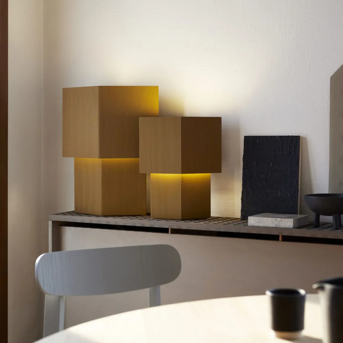 Romb est né de l’expérimentation par Broberg & Ridderstråle d’un carton ondulé qu’ils utilisent beaucoup pour modéliser et développer des projets d’architecture. La forme, un losange, a émergé rapidement et s’est divisée en deux formes ; l’un plus grand que l’autre, qui projette une intéressante lumière directe vers le haut mais aussi indirecte vers le bas, sur la base de la forme. La pièce fonctionne bien sur des espaces étroits comme des étagères ou des rebords de fenêtre, et a une forte présence sculpturale, qu’elle brille ou non. Romb est fabriqué à partir d’acier embouti sur mesure avec des bords sans couture et une grande attention aux détails.