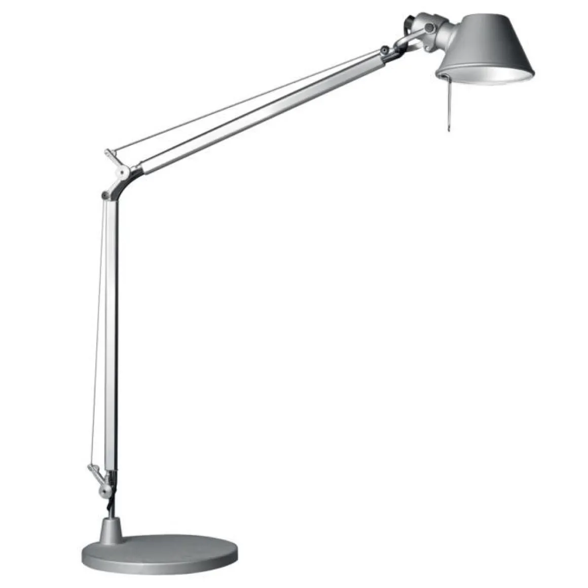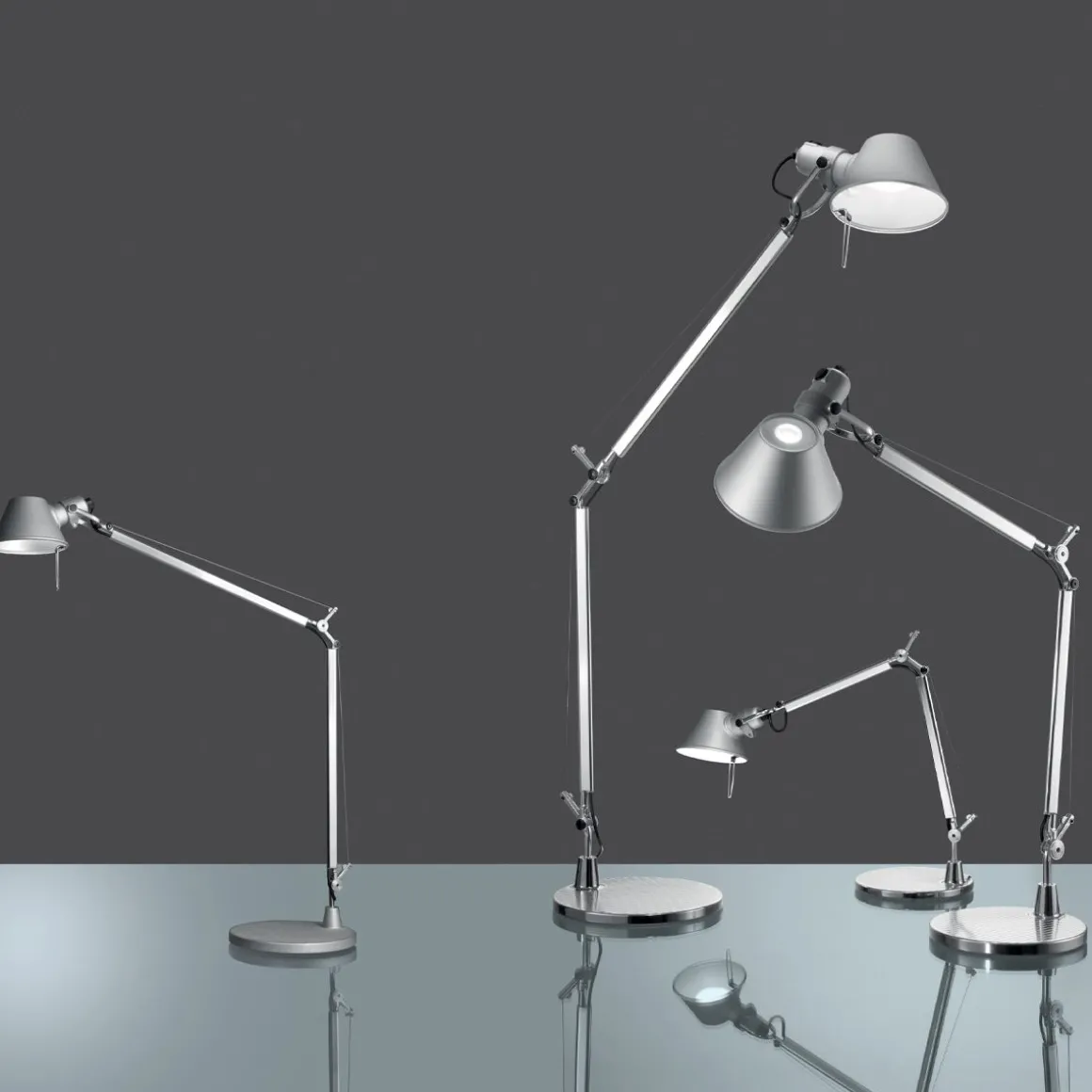 Extension de la gamme Tolomeo. La dimension du diffuseur est identique à celui de la Tolomeo Micro, celles de la structure et des bras sont plus importantes, lui permettent d’être utilisée sur les tables de travail et les bureaux. La puissance est variable jusqu’à atteindre 9W.