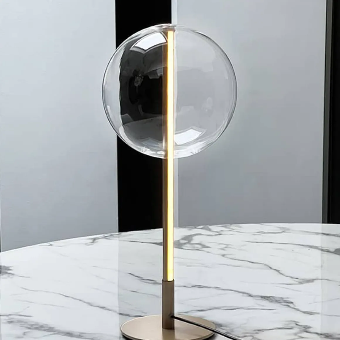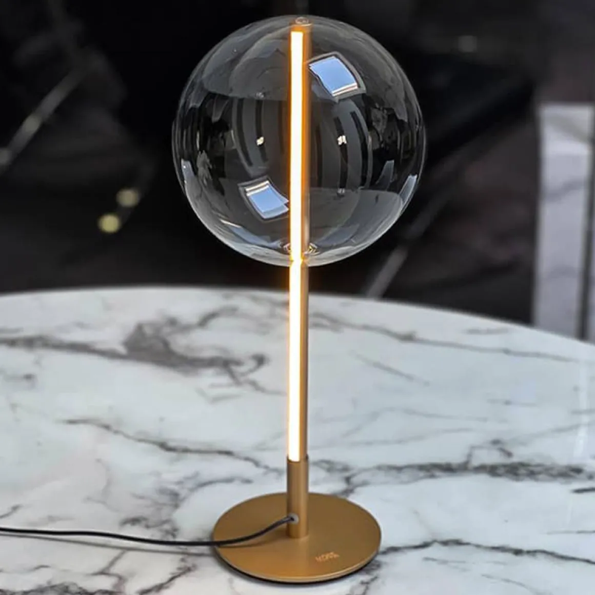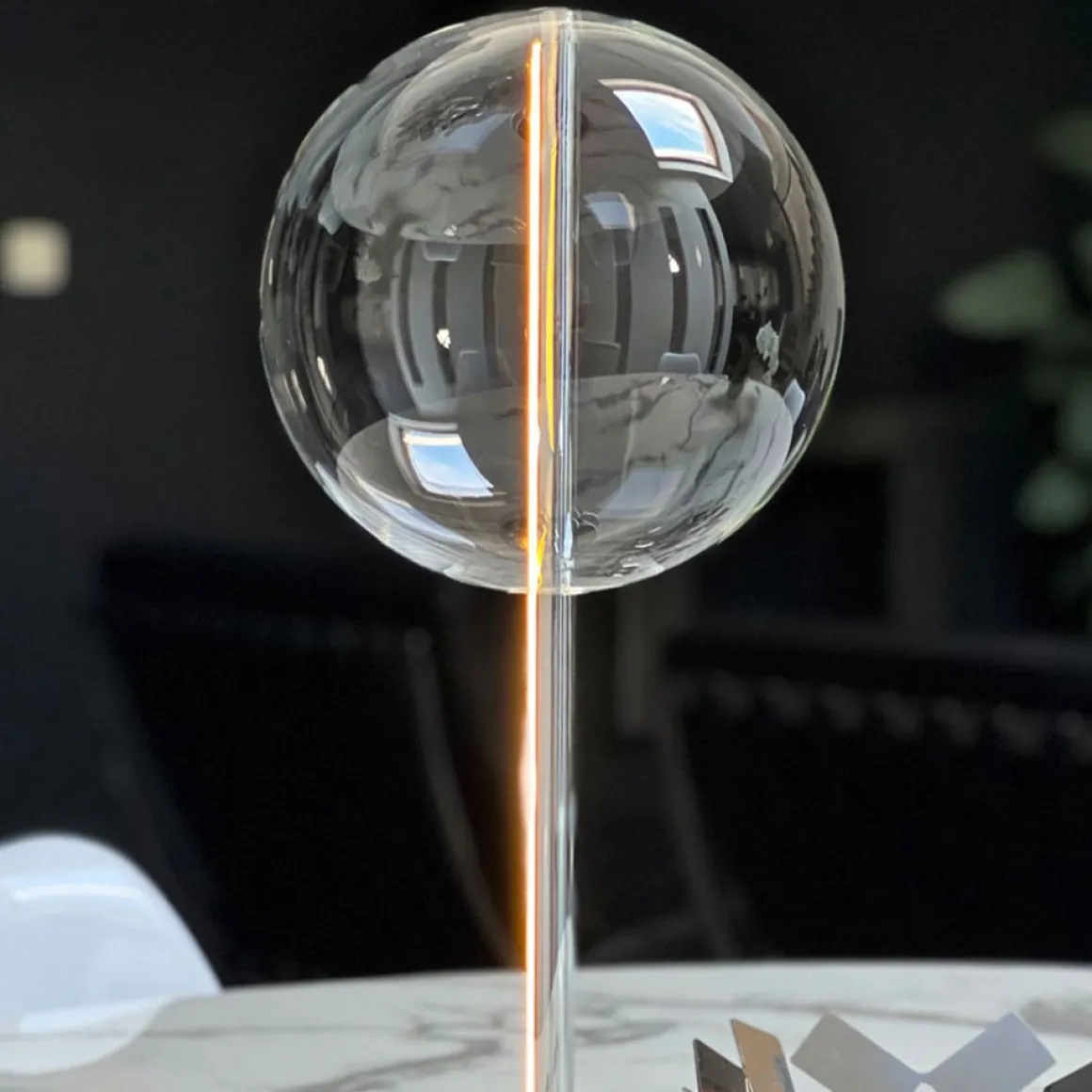 La lampe de table design B-111 au style minimaliste et vintage technique dans un esprit résolument 70’s. La lampe à éclairage variable se compose d’un tube en aluminium rainuré d’où s’extrait une lumière discrète et fonctionnelle et d’une bulle de verre italien de 20 cm de diamètre, soufflé à la bouche.