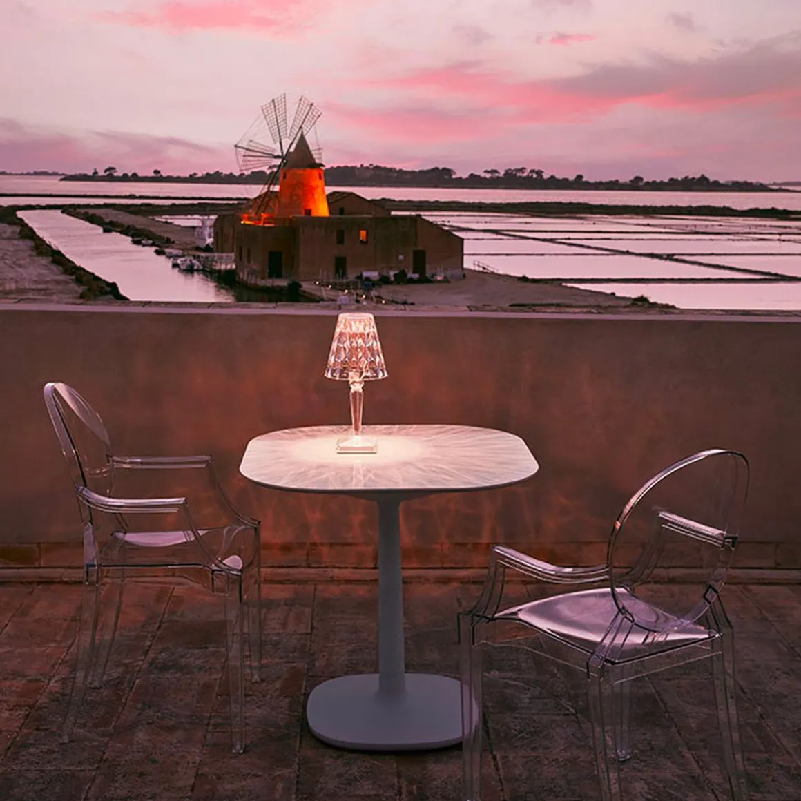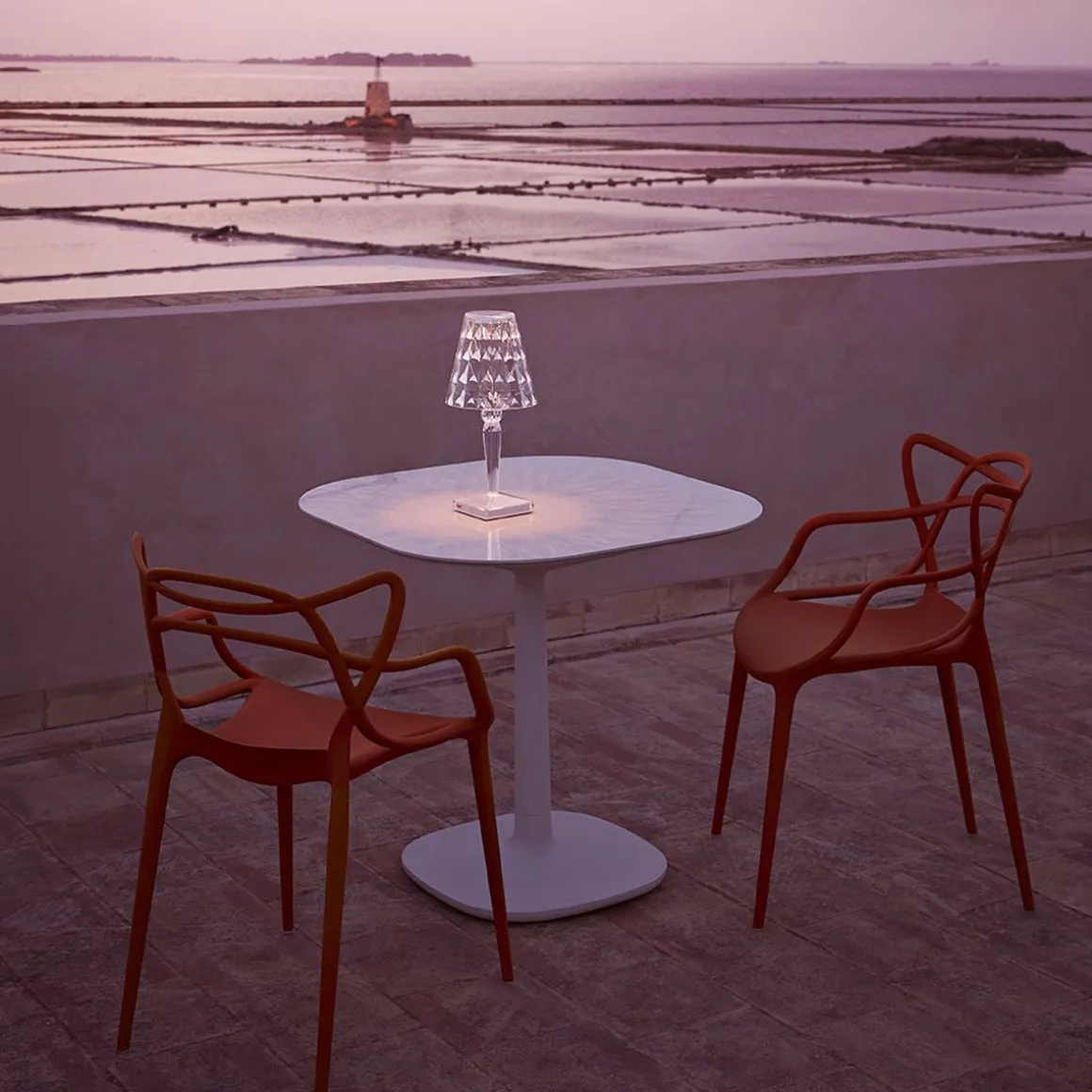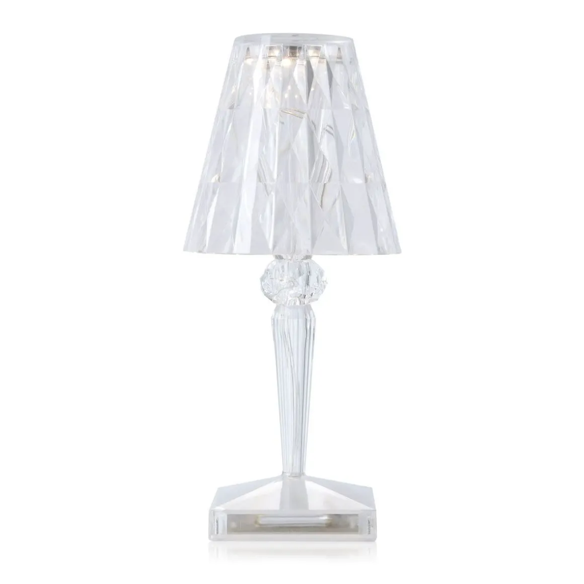 Lampe à abat-jour culte, Battery est un luminaire de taille réduite réalisé en PMMA transparent. La grande nouveauté réside dans le fait que, grâce à son alimentation par câble USB, ce produit est rechargeable à 100 %. Son autonomie peut atteindre 6 heures. Déplaçable en toute simplicité, il est ainsi idéal pour les espaces collectifs ou les bars/restaurants en plein air. Battery se compose d’un réflecteur de couleur cristal à surface facettée donnant naissance à d’envoûtants jeux de lumière. Ce produit est complété par une version entièrement réalisée à partir de différentes nuances de transparence.