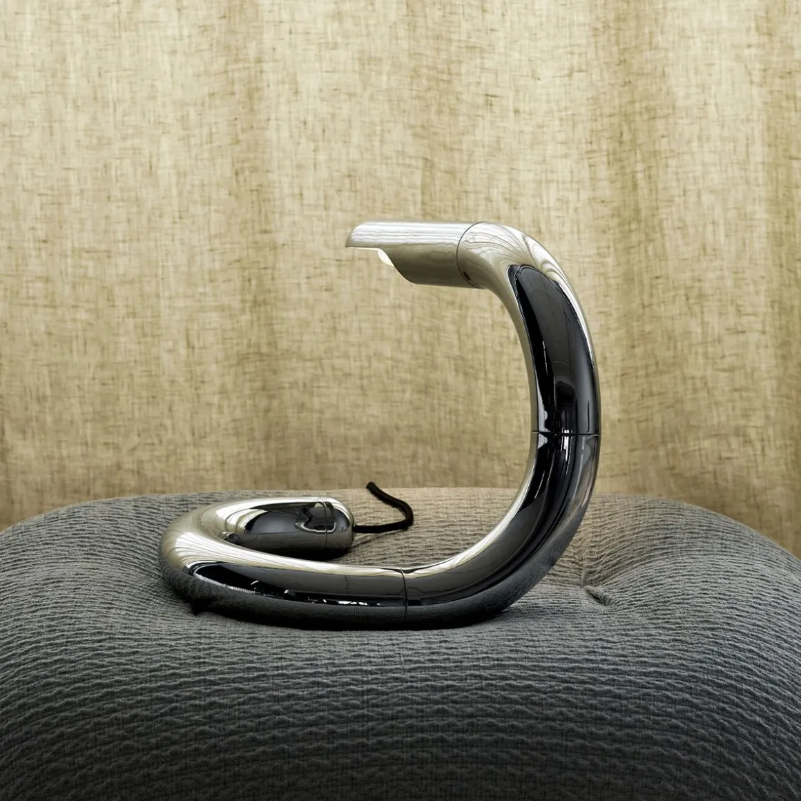 De forme serpentine, magnifiquement équilibrée et brillante comme un bijou, la lampe de table Aspide de Gianfranco Frattini est à la fois une pièce de design industriel brillamment pratique et une déclaration de design irrésistiblement ludique. Développée pour la première fois en 1970, l’Aspide est une lampe de table hautement orientable qui ne ressemble à aucune autre lampe avant ou depuis, mais qui exprime toujours les goûts matériels et esthétiques de son époque. La lampe de table Aspide doit son nom au mot italien signifiant « asp », faisant référence à sa forme sinueuse en forme de serpent. Un revêtement de chrome brillant confère à Aspide une surface semblable à un miroir qui reflète la propre lumière de la lampe. Cet éclat brillant confère à la lampe une sensation de préciosité et de ludique : entre les mains de Frattini, glamour et fantaisie peuvent coexister dans un seul objet.