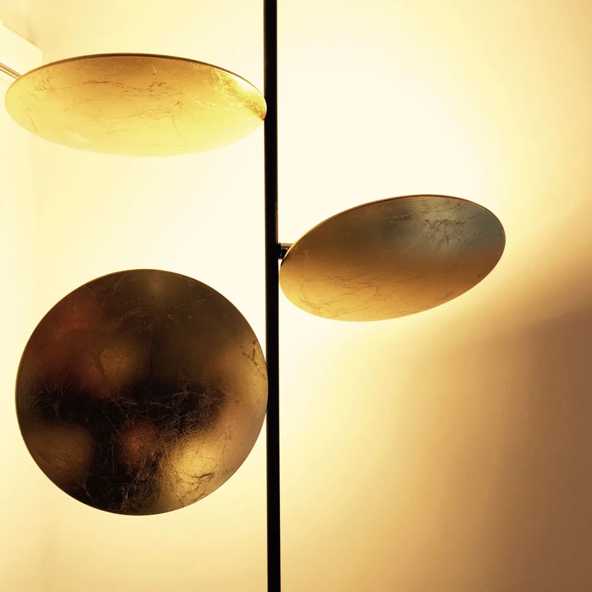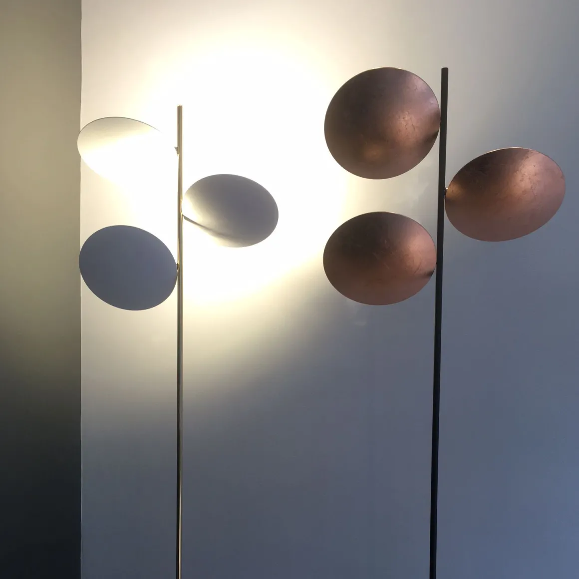 Matériaux : tige et base en métal, disque en aluminium doublé d’une feuille colorée.