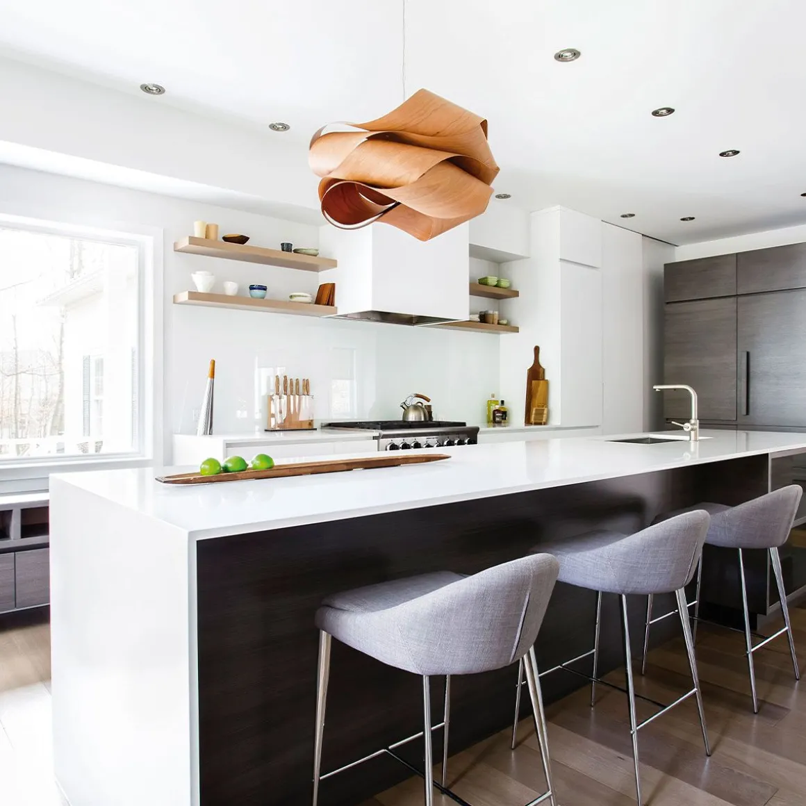 Conçu par Ray Power, Link apparait avec une fringale exceptionnelle dans ses bandes de placage de bois empilées Möbius. En mathématiques, la bande de Möbius est une surface avec un côté continu, ce qui signifie que la lumière de Link est non seulement belle, mais qu’elle est aussi intelligente. Grâce à sa structure volumineuse, semblable à un nuage, Link est résolument facile à regarder. De forme ponctuelle, la forme flottante de la lampe illustre de manière intelligente le potentiel important du bois dans la conception des éclairages.