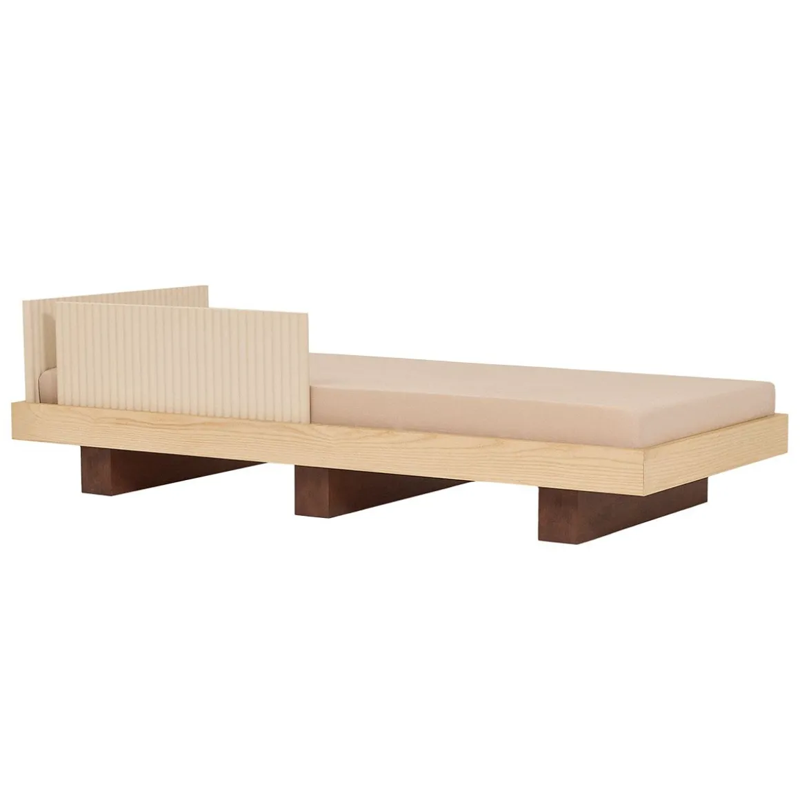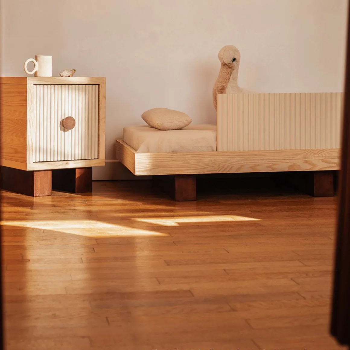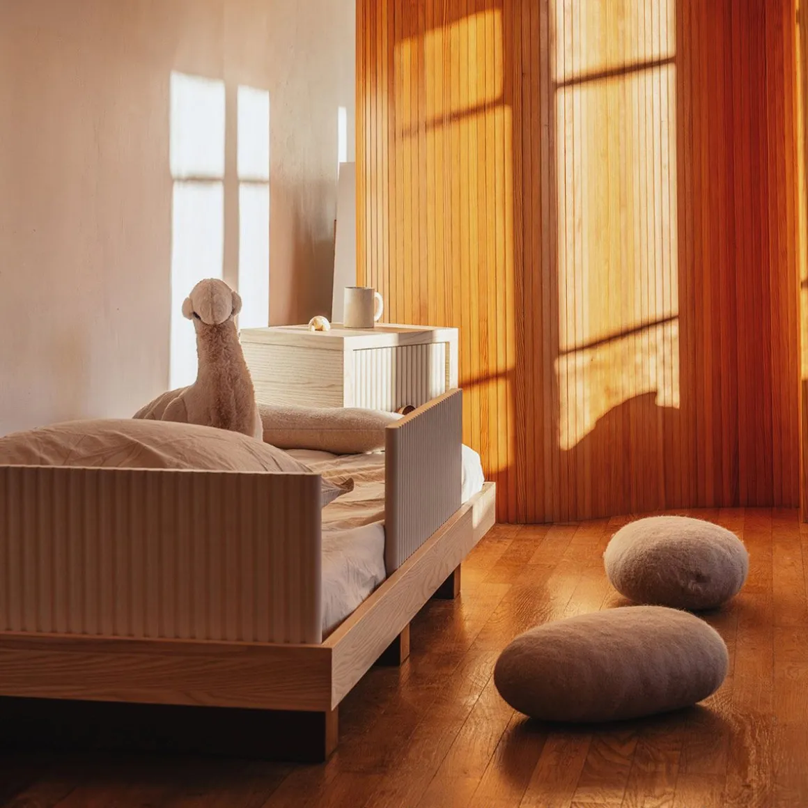 Lit junior & daybed de Nobodinoz par le studio Heju. Concoctez une Chambre Minimale et Ludique avec la Collection Heju x Nobodinoz. C’est avec subtilité et douceur que Studio Heju a imaginé ce daybed évolutif qui met à l’honneur des matériaux naturels et la simplicité des lignes épurées. Un véritable plaisir pour les passionnés de design : les pieds du lit, inspirés des geta, les sandales traditionnelles en bois, nous transportent au Japon, tandis que les éléments latéraux finement texturés créent de subtils jeux d’ombres et de lumière. Ce geste esthétique devient une expérience ludique pour les enfants, qui adorent explorer les reliefs du bout des doigts. Le contraste entre le bois naturel et le bois teinté foncé apporte une touche de raffinement à cette pièce d’exception. De plus, les éléments latéraux amovibles permettent de transformer le lit en Daybed, idéal pour créer un coin détente près d’une fenêtre ou pour embellir une entrée.