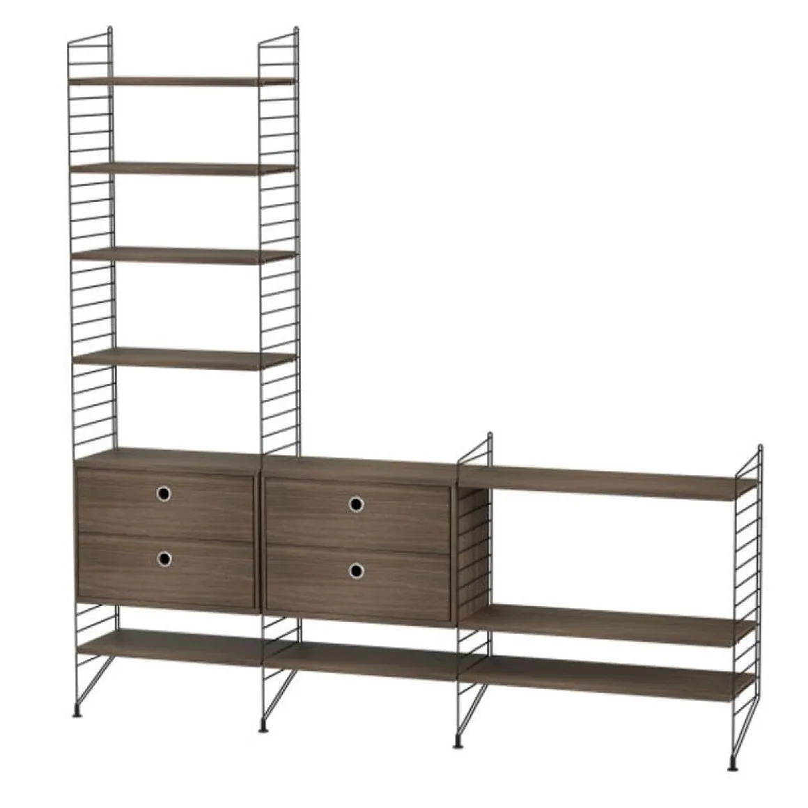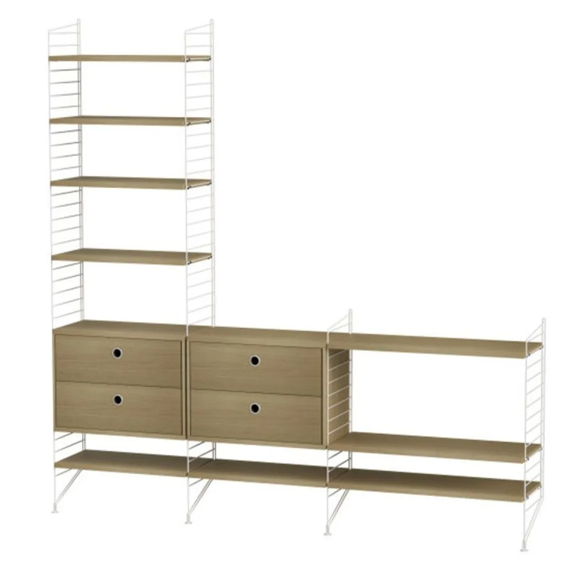 Cette combinaison ouvre à la créativité. Rangez tout ce dont vous avez besoin sur les étagères et dans les tiroirs et personnalisez l’ensemble en accrochant un tableau à côté des panneaux du plancher supérieur. Ou laissez simplement la peinture reposer sur les étagères.