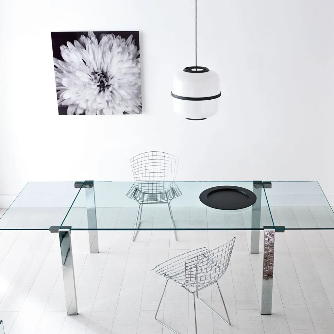 Matériaux : plateau en verre transparent avec rallonges transparentes, pieds chromés