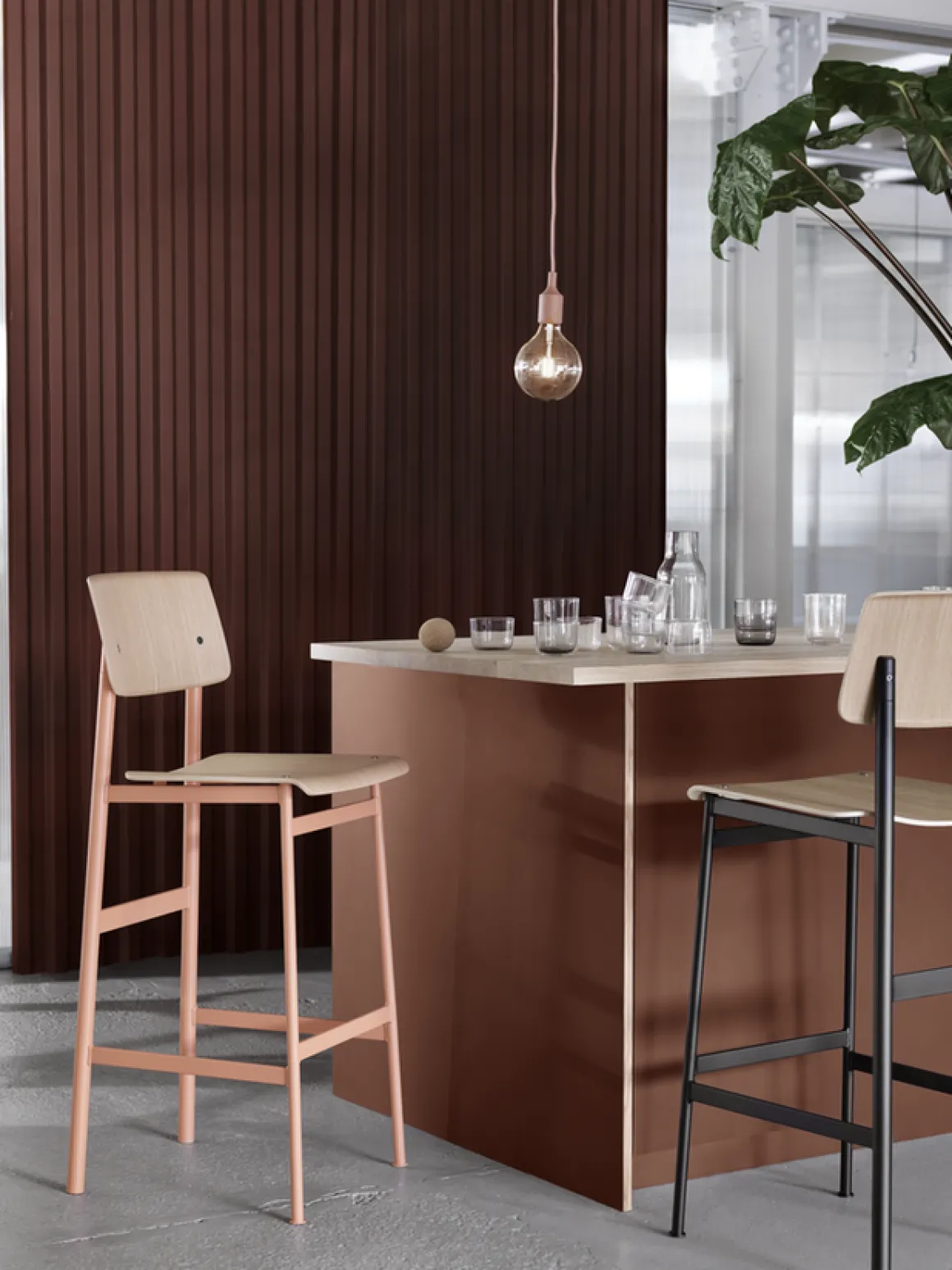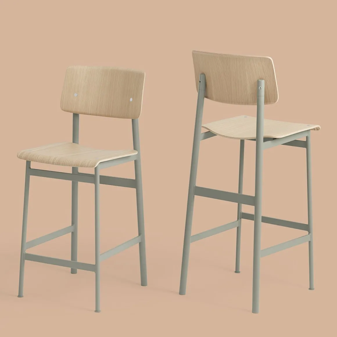 Le tabouret équilibre les matériaux avec son siège et dos en chêne, et la structure en acier enduit de poudre.