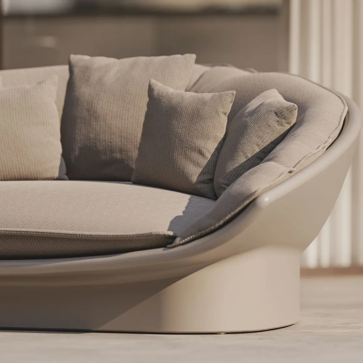 Le lit de repos Luna, conçu par Ramón Esteve, allie durabilité et confort absolu. Fabriqué en polyéthylène 100 % recyclable par rotomoulage, il intègre de la mousse de polyuréthane et des coussins en fibres synthétiques, garantissant un repos exceptionnel.